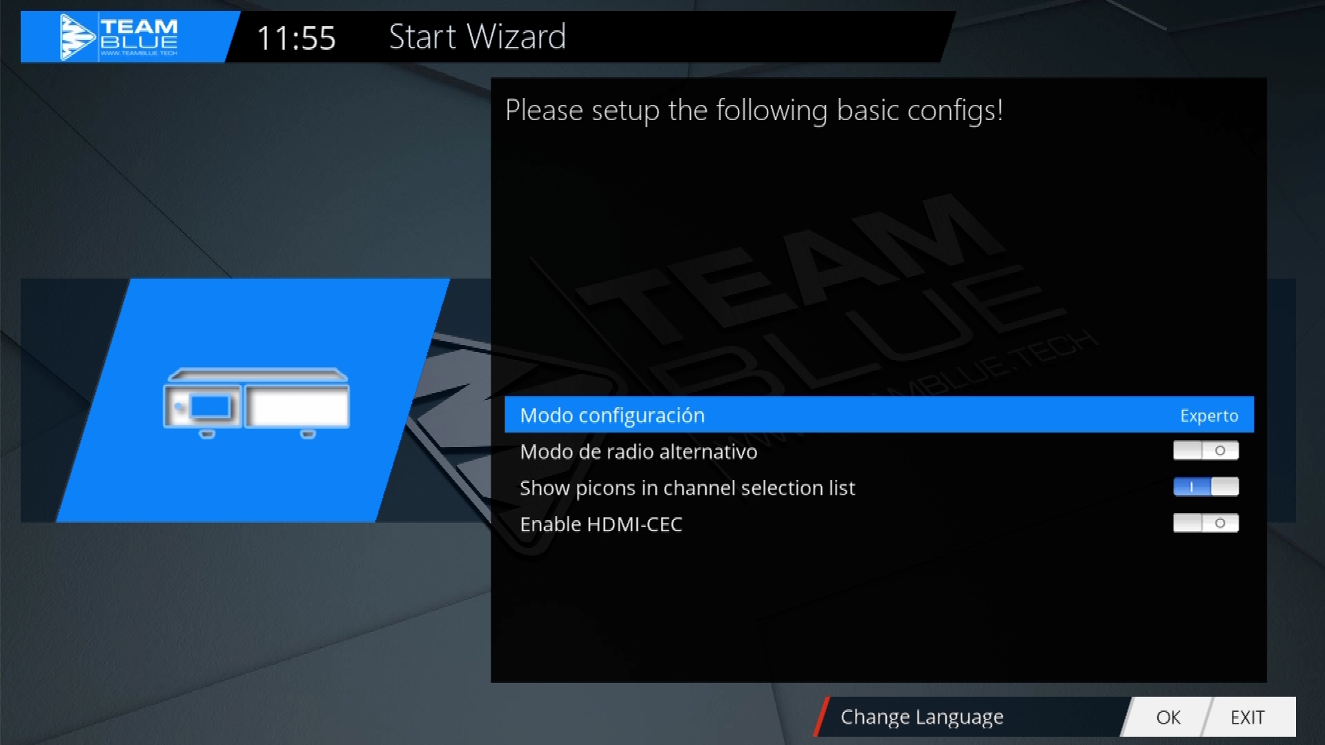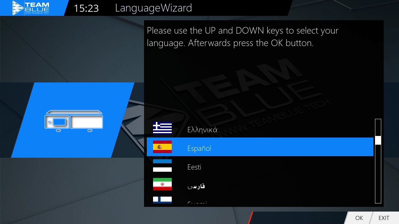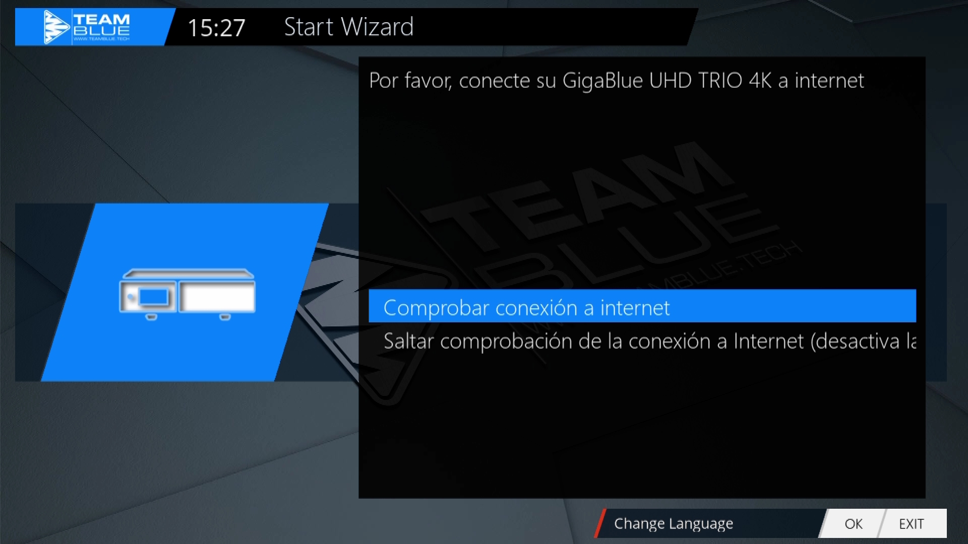 Conectamos el Gigablue Trio 4K al adaptador de corriente y tras pulsar el boton power trasero se inicia el receptor apareciendo durante el proceso de inicio «boot» y conteo de carga en el display del receptor donde se iluminara el led frontal en tono azul, este proceso dura aproximadamente 40 segundos hasta que comienza la configuracion basica de la imagen enigma2 por defecto que en este caso es TeamBlue imagen oficial de Gigablue. El sistema se mueve de forma fluida gracias a su cpu Hisilicon Hi3798MV200 quad core 1600MHz.