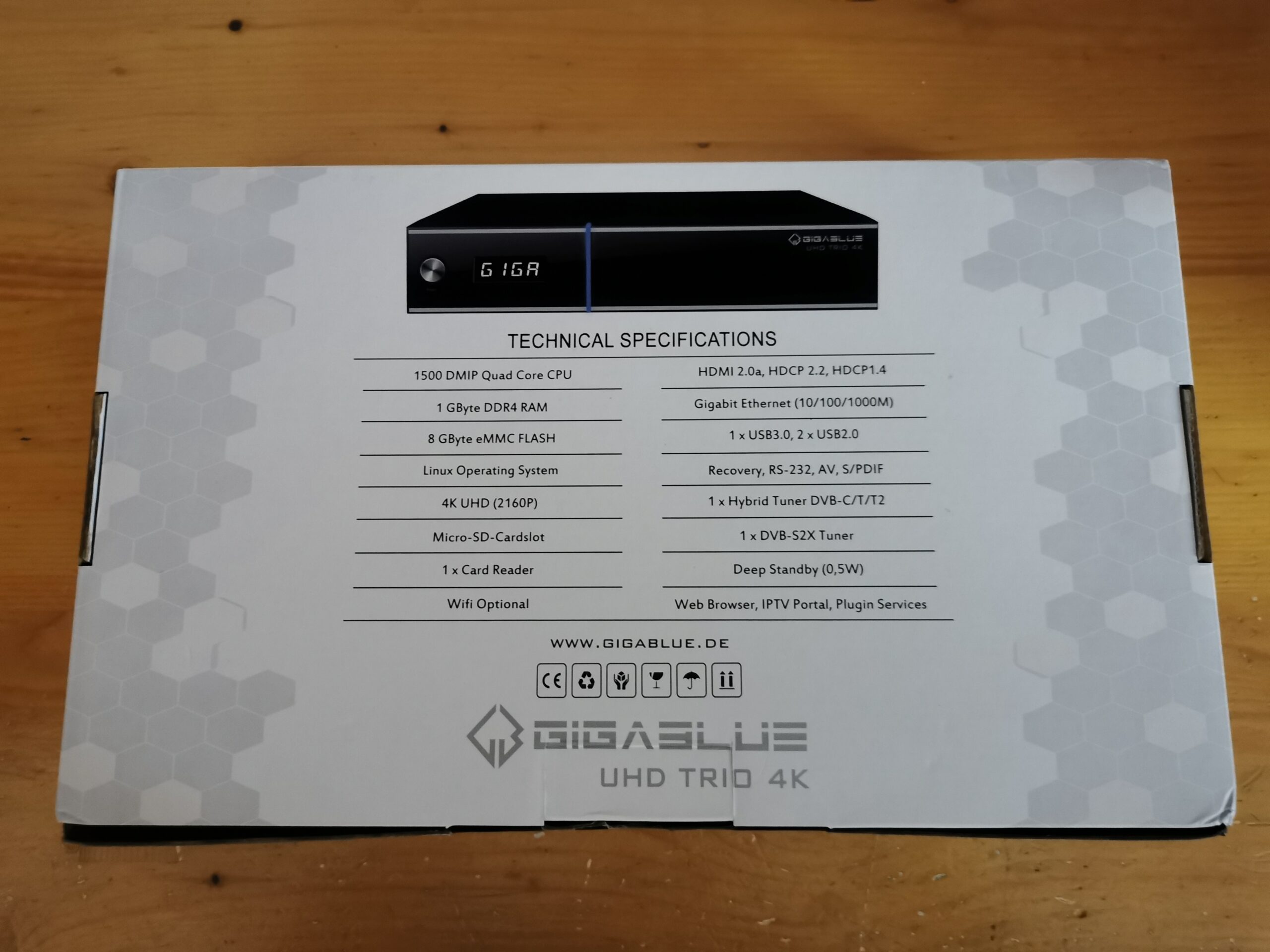 Este receptor Gigablue trio 4K se presenta en una caja de carton de buena calidad en colores claros serigrafiada modelo y caracteriscticas del mismo, en el interior tenemos el receptor, mando a distancia, cable hdmi 2.0, manual de instrucciones, pilas y el adaptador de corriente.