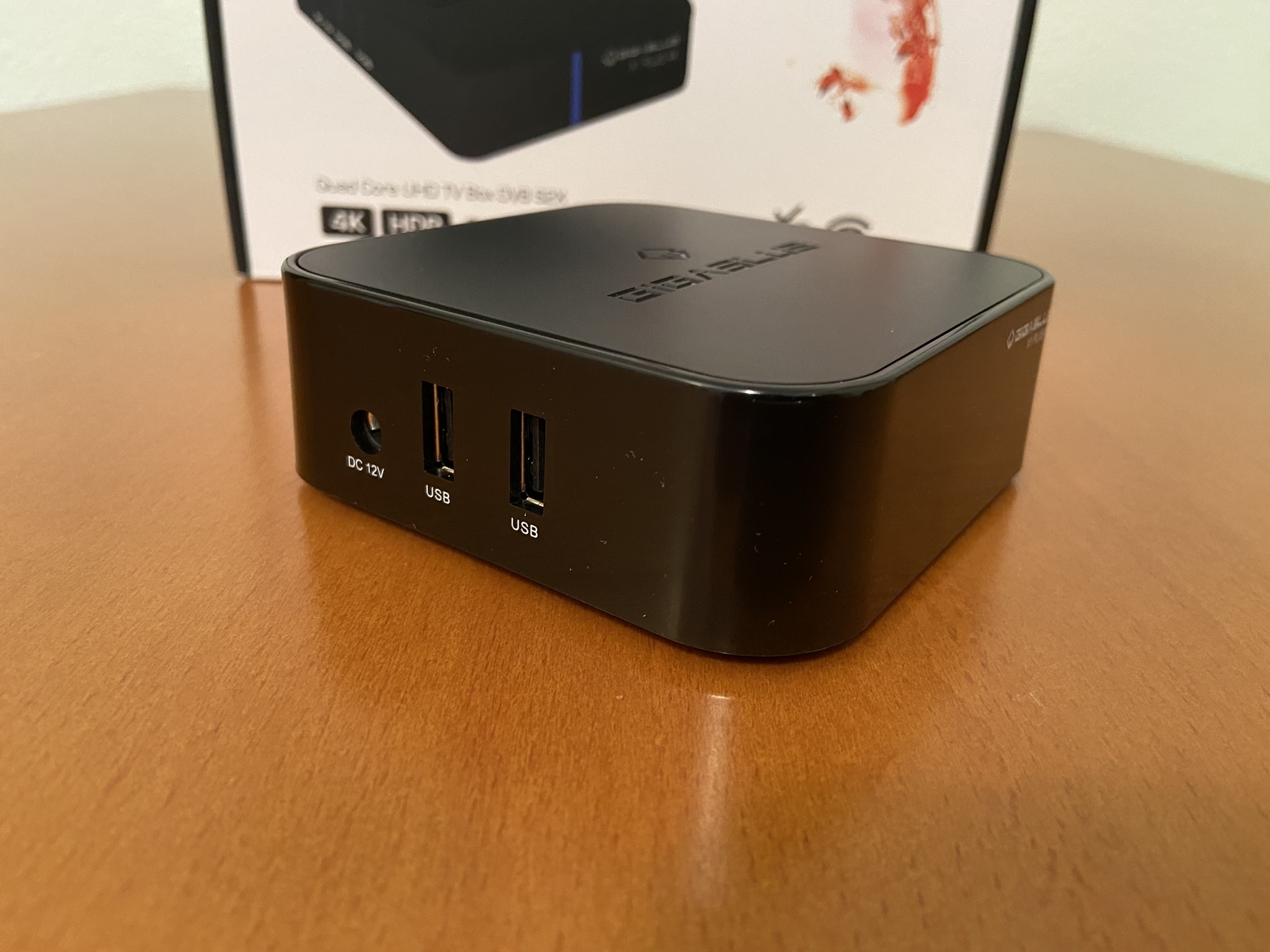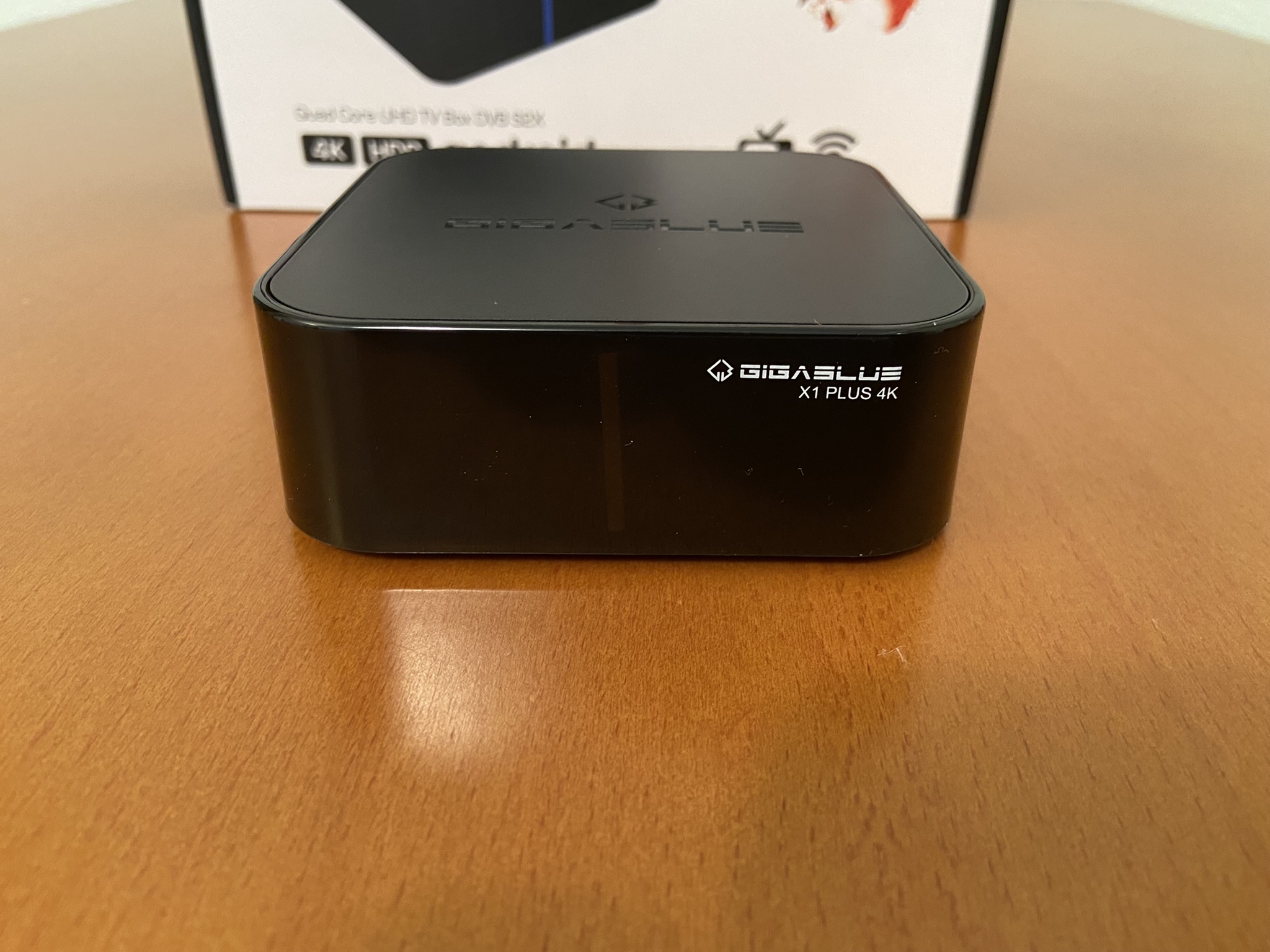 Gigablue X1 Plus 4K está disponible en un elegante diseño negro con dimensiones de 95 mm х 35 mm х 95 mm (ancho x alto x profundidad). En el panel frontal hay una pantalla LCD, asi como el logotipo de la marca y leed de encendido y apagado. En el lado izquierdo de la caja encontramos dos entradas usb 2.0, asi como entrada para el cable de alimentacion.