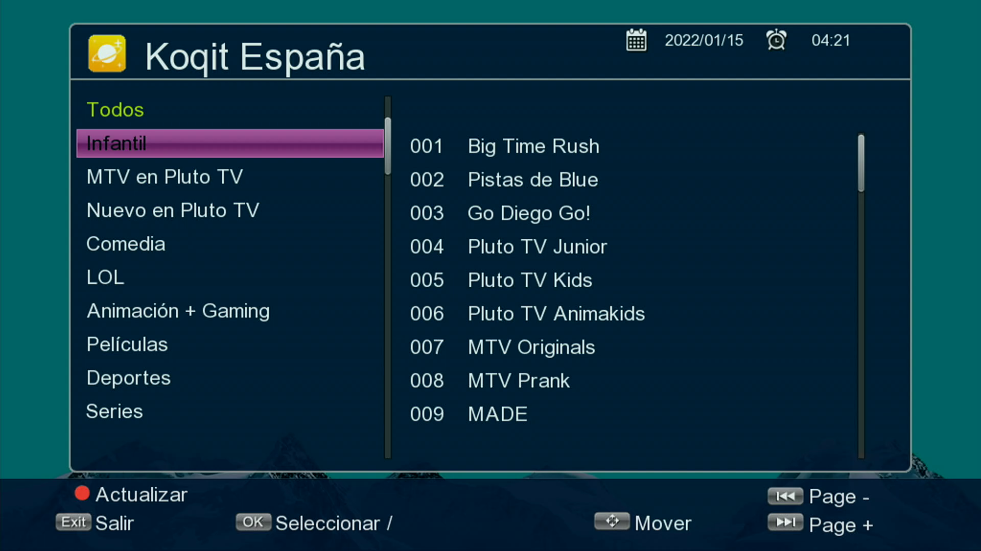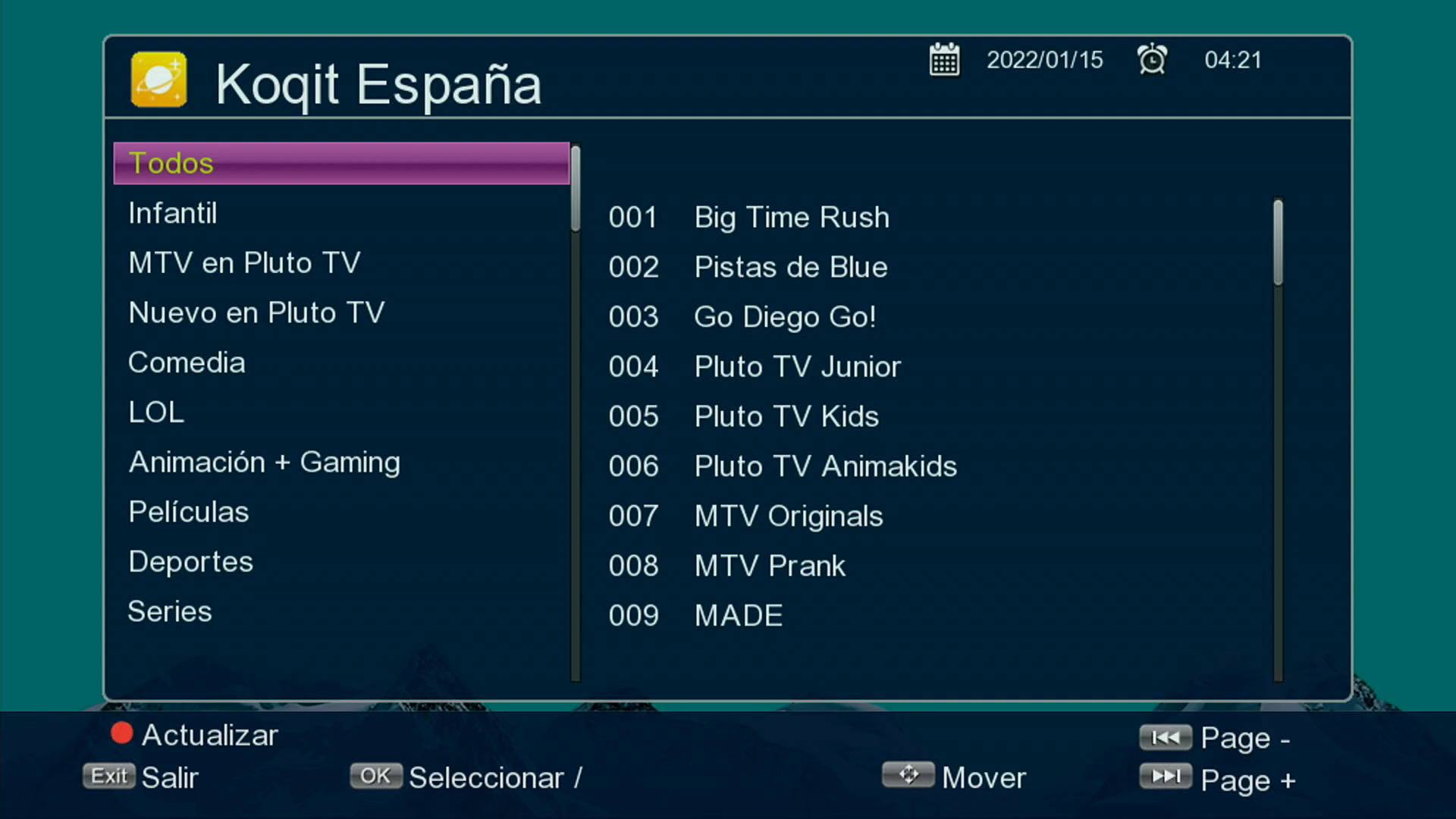 - Icono IPTV, en este caso accedemos a canales gratuitos que pone el fabricante, en español basados en Pluto.TV, ademas podemos cargar una lista canales m3u.