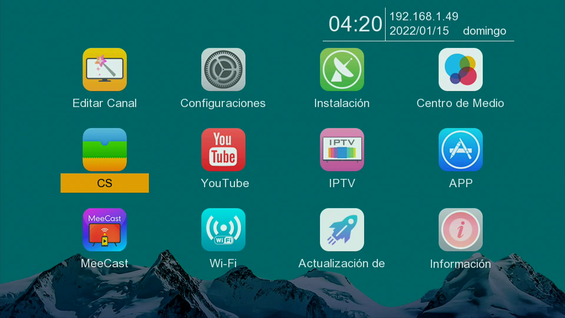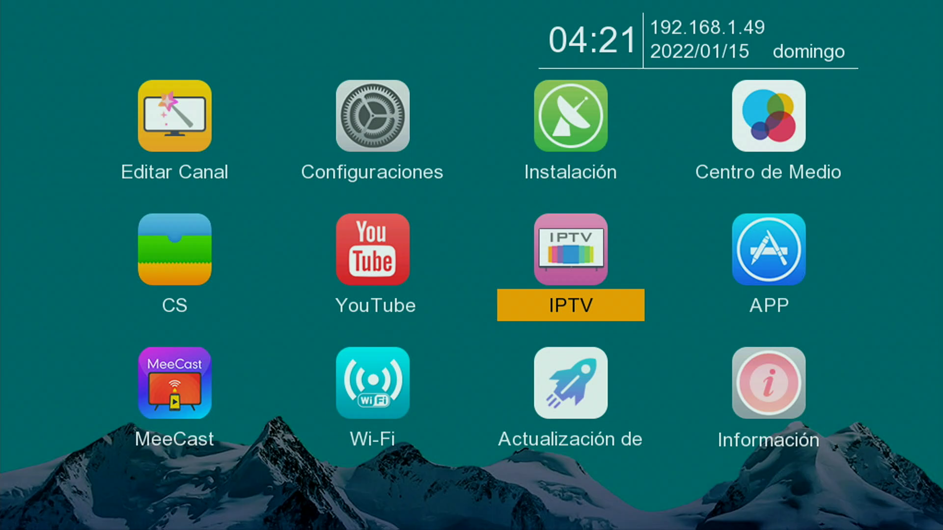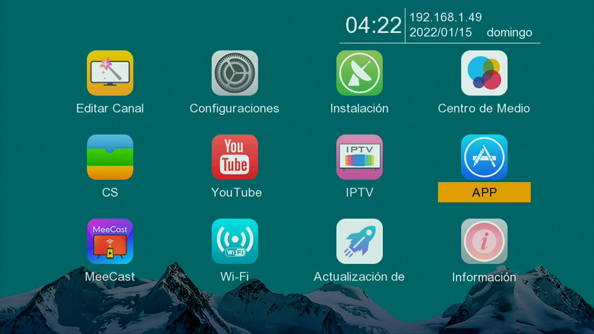 - Pantalla inicial: tipo launcher Ecos que nos permite acceder a las distintas opciones de sat, iptv, ajustes y app.