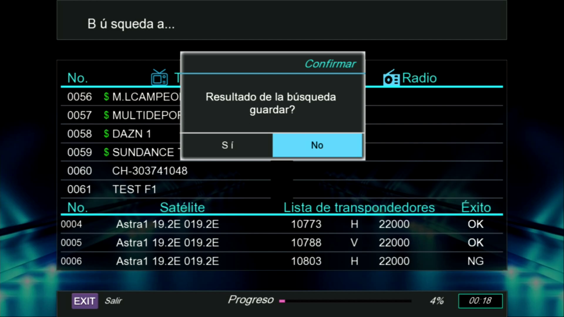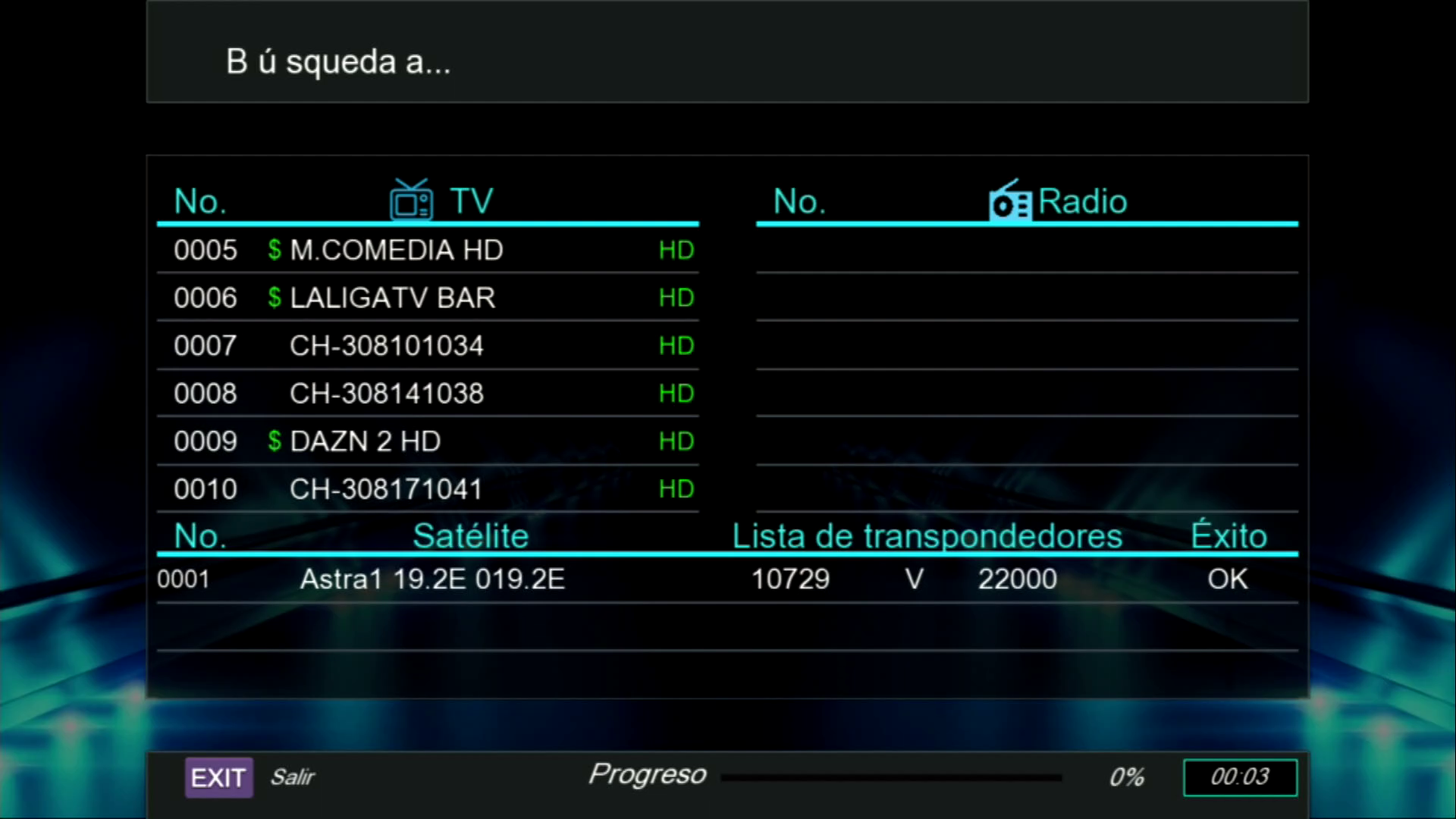 - Busqueda canales automatica: Tiempo 5 minutos 34 segundos