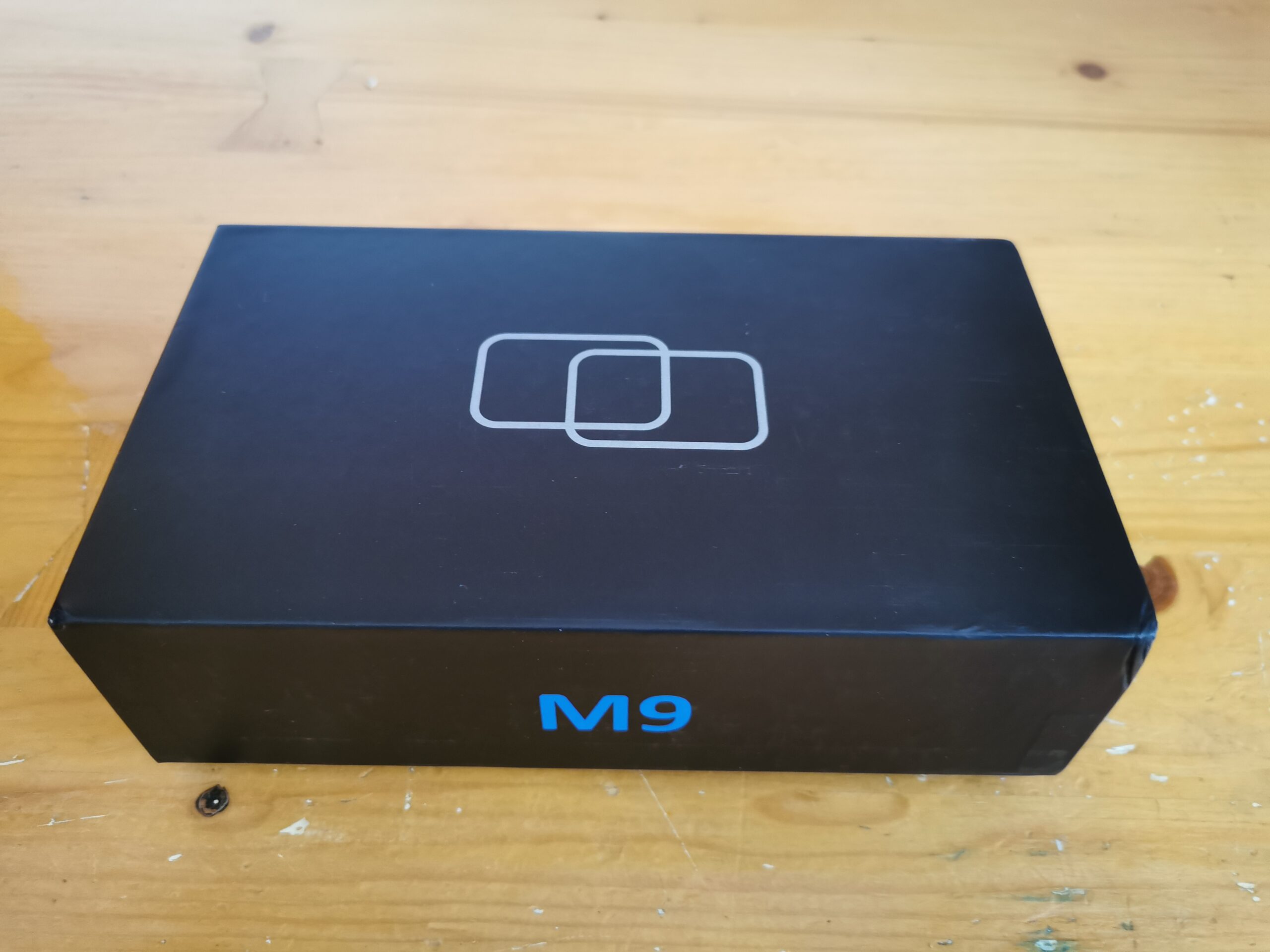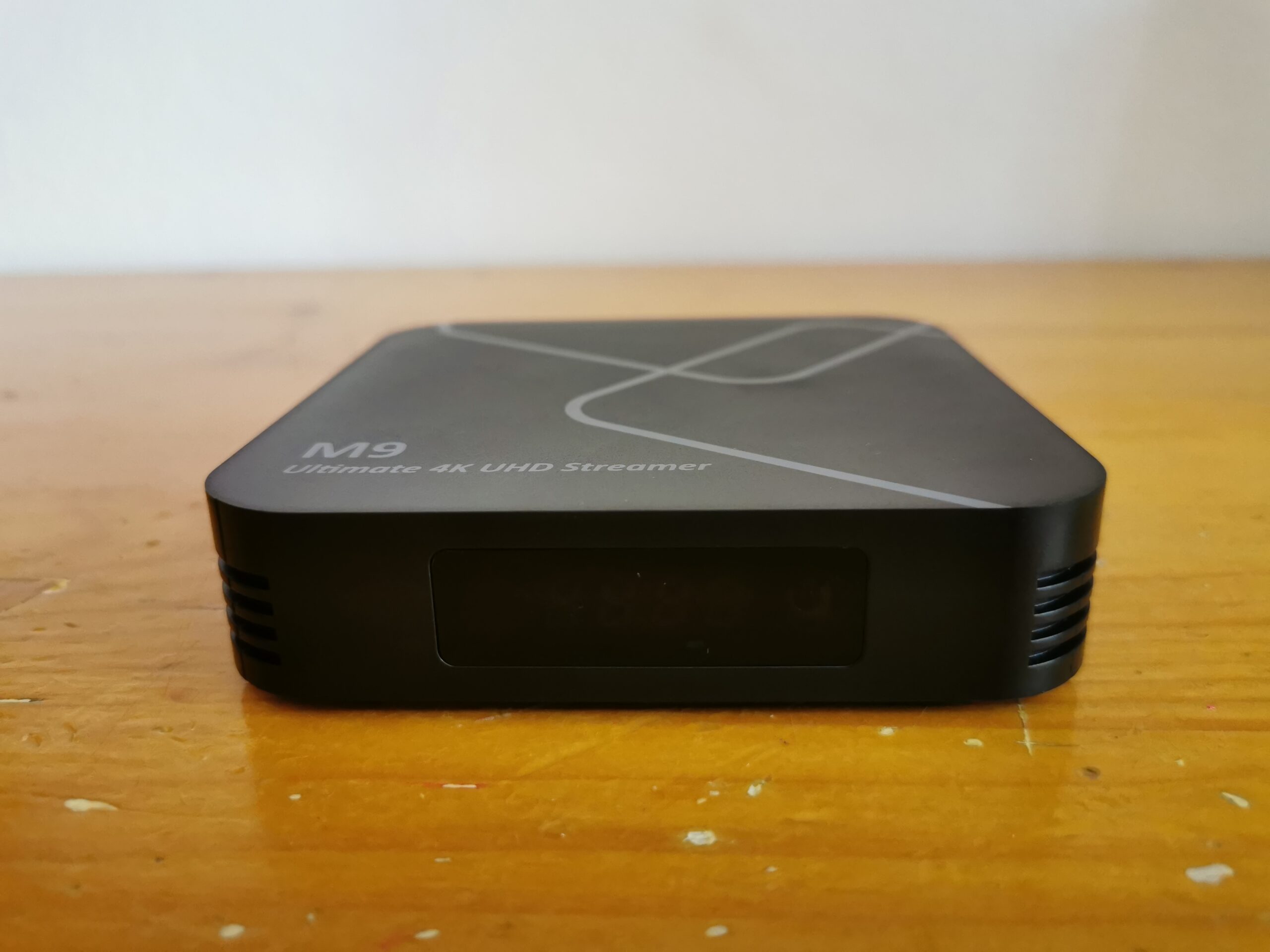 Esta TV Box Mu M9 tiene un diseño en plastico de forma cuadriculada con bordes redondeados, en el frontal tenemos una pequeña lcd de 7 segmentos Tipo reloj, en su parte superior serigrafiado el modelo de Box de la marca. El mismo se enciende automaticamente al conectarlo a la red electrica y se controla con un mando basico tipo IR.