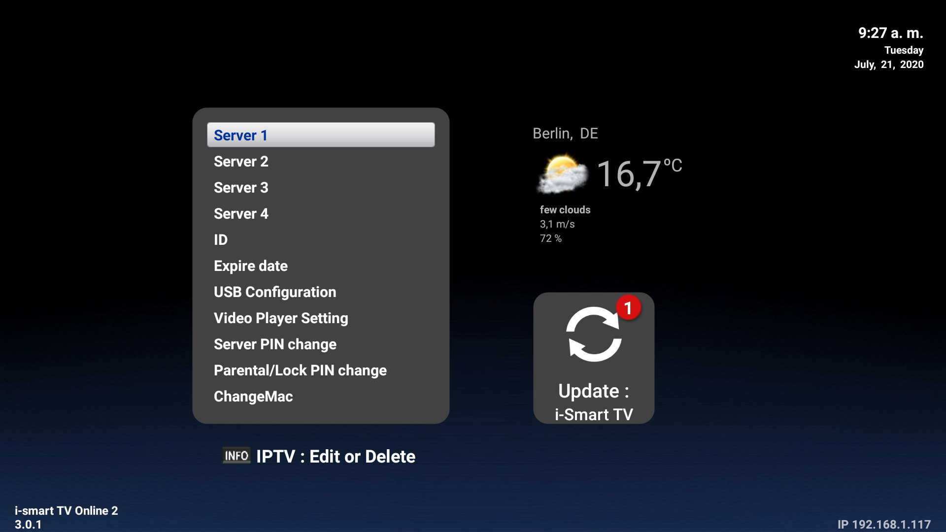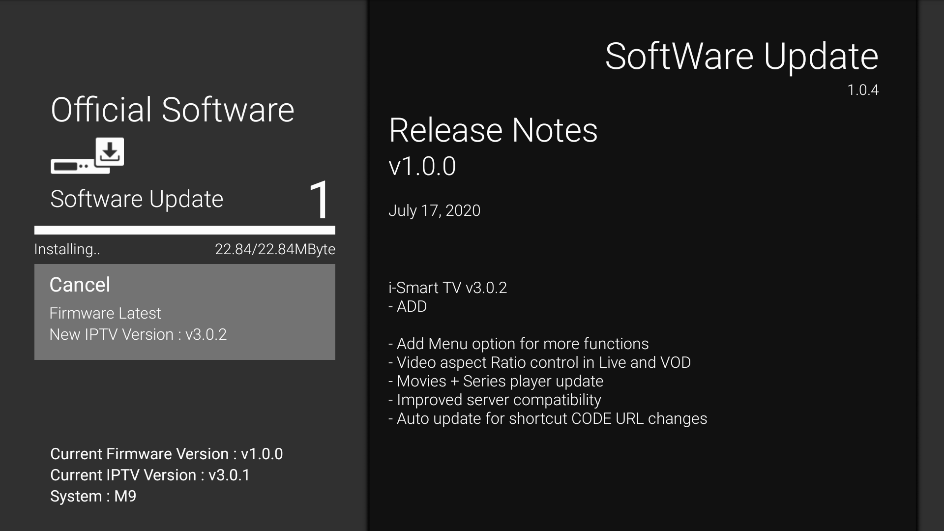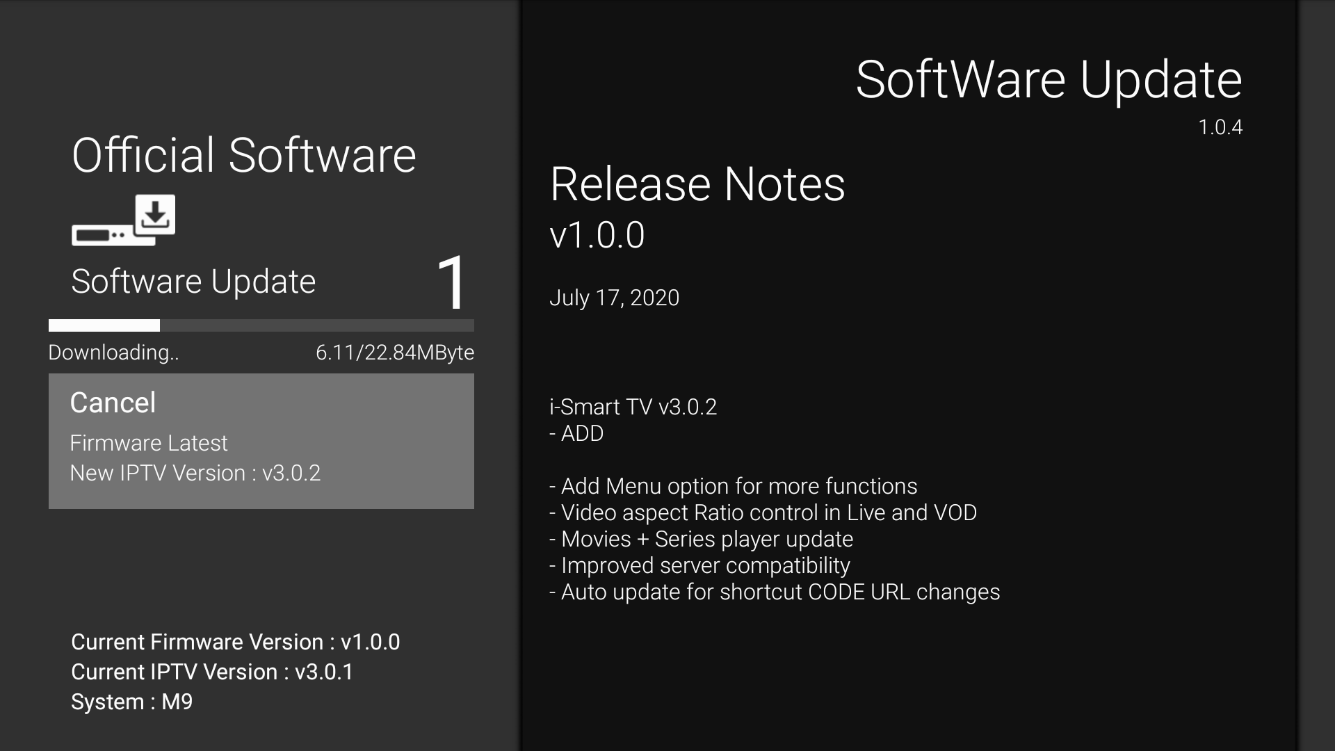 Al encender nuestra TV Box Mu M9 esta arranca con sistema operativo Android 9 Pie, el launcher que utiliza es i-Smart IPtv proporcionado por el fabricante medi@link, enfocado las app por defecto al sistema Iptv, en las siguientes capturas podemos observar el proceso de actualización upgrade del sistema tipo OTA a traves del menu: