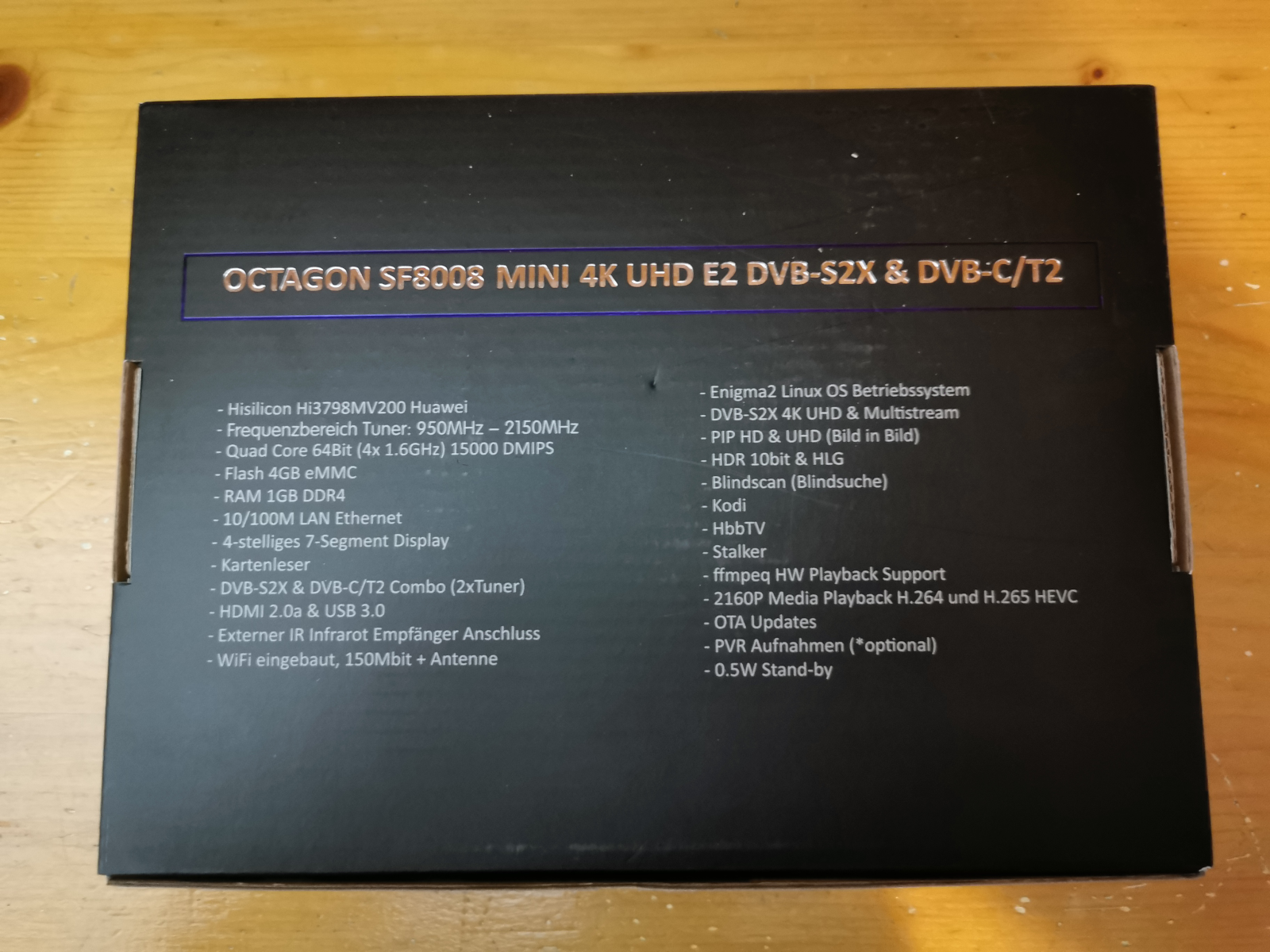 Se monta con procesador Hisilicon Hi3798MV200 Huawei Quad Core 64Bit (4x 1.6GHz) 15000 DMIPS junto a gpu Mali 450, 1 GB de ram DDR4, 4 GB de almancenamiento interno tipo emmc, adaptador wifi interno y como sistema operativo de fabrica OpenATV. Este Receptor en la actualidad se vende version combo DVB-S2X y DVB-C / T2 (2xTuner), es decir un receptor combo satelite + tdt, aunque no se descarga como paso con su hermano mayor que proximamente aparezcan otras combinaciones de tuner.