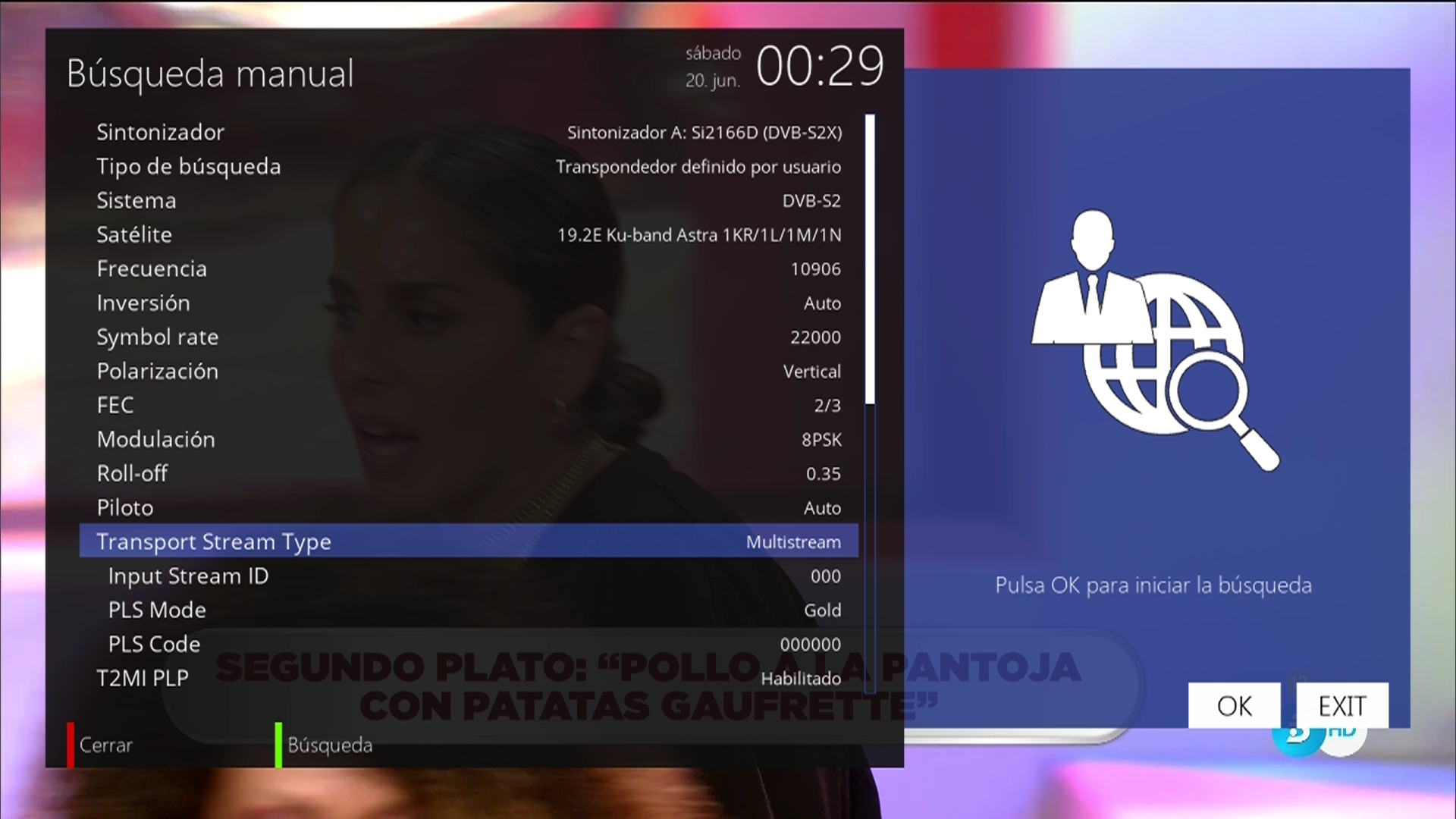 El sintonizador satelite es el modelo Si2166D DVB-S2X que permite captar canales tanto multistream, S2X y T2mi