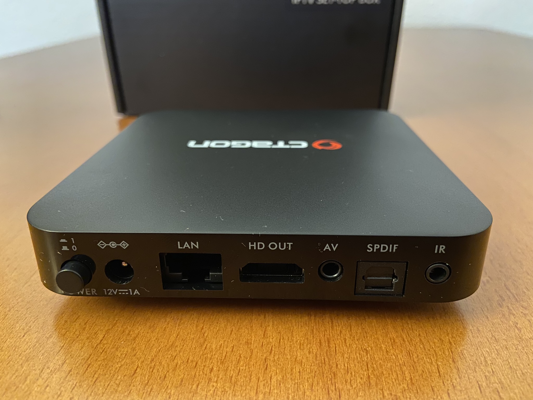 En la parte posterior es donde se hallan el grueso de conectores, ubicados de izquierda a derecha, boton de encendido y apagado, entrada fuente alimentacion, entrada tarjeta de red ethernet, Salida hdmi, salida AV, spedif y conector Ir.