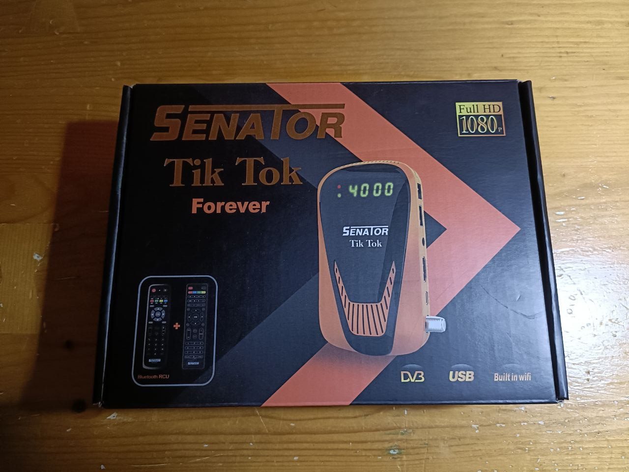 Senator Tik Tok forever se presenta en una caja de carton con colorido en tonos negros y naranjas, donde se serigrafian las caracteristicas del receptor, en el interior nos encontramos: