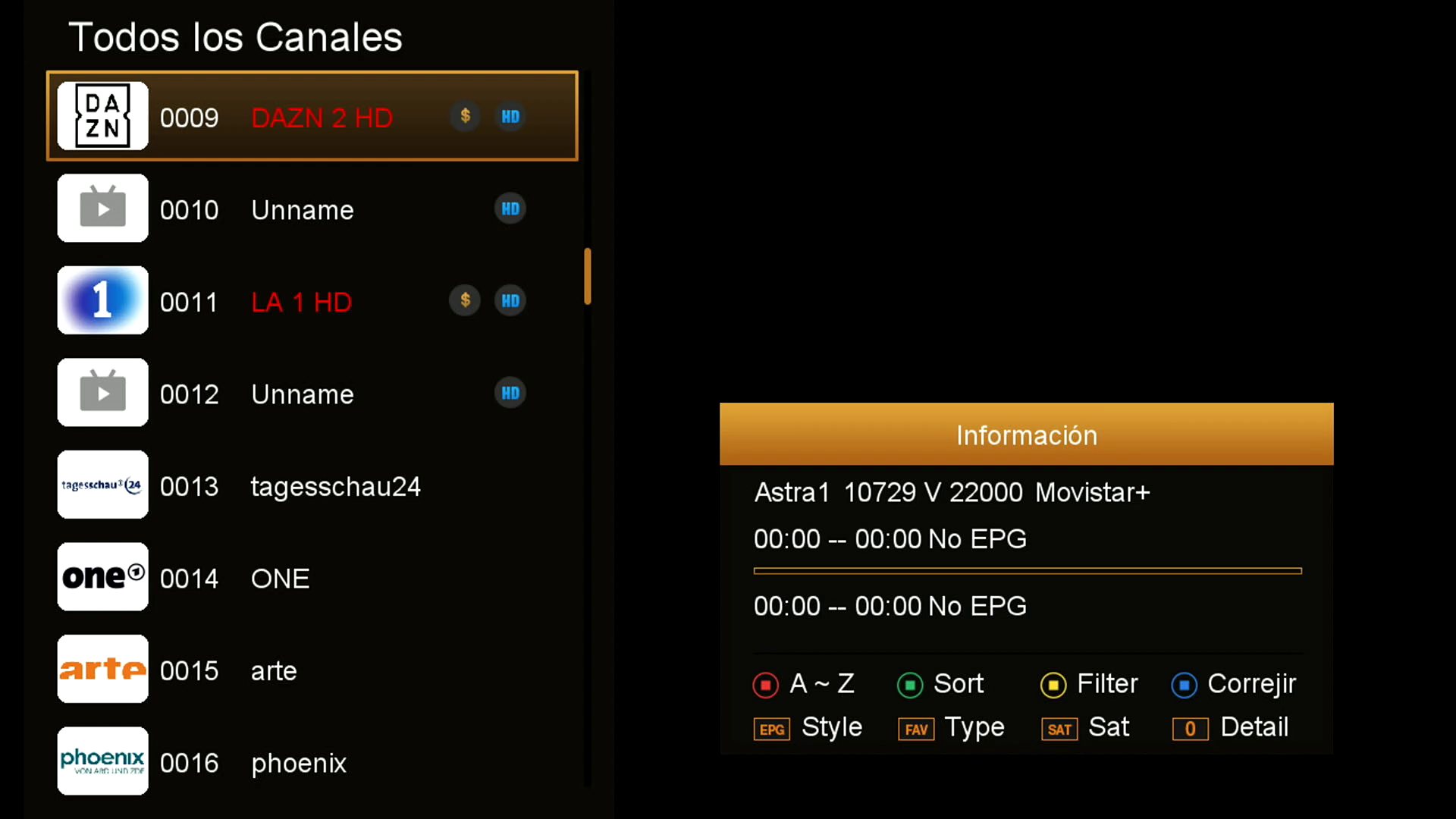 Es el encargado de la gestion del tuner Satelite. A traves de esta opción podemos gestionar los canales Satelite, con las siguientes características: