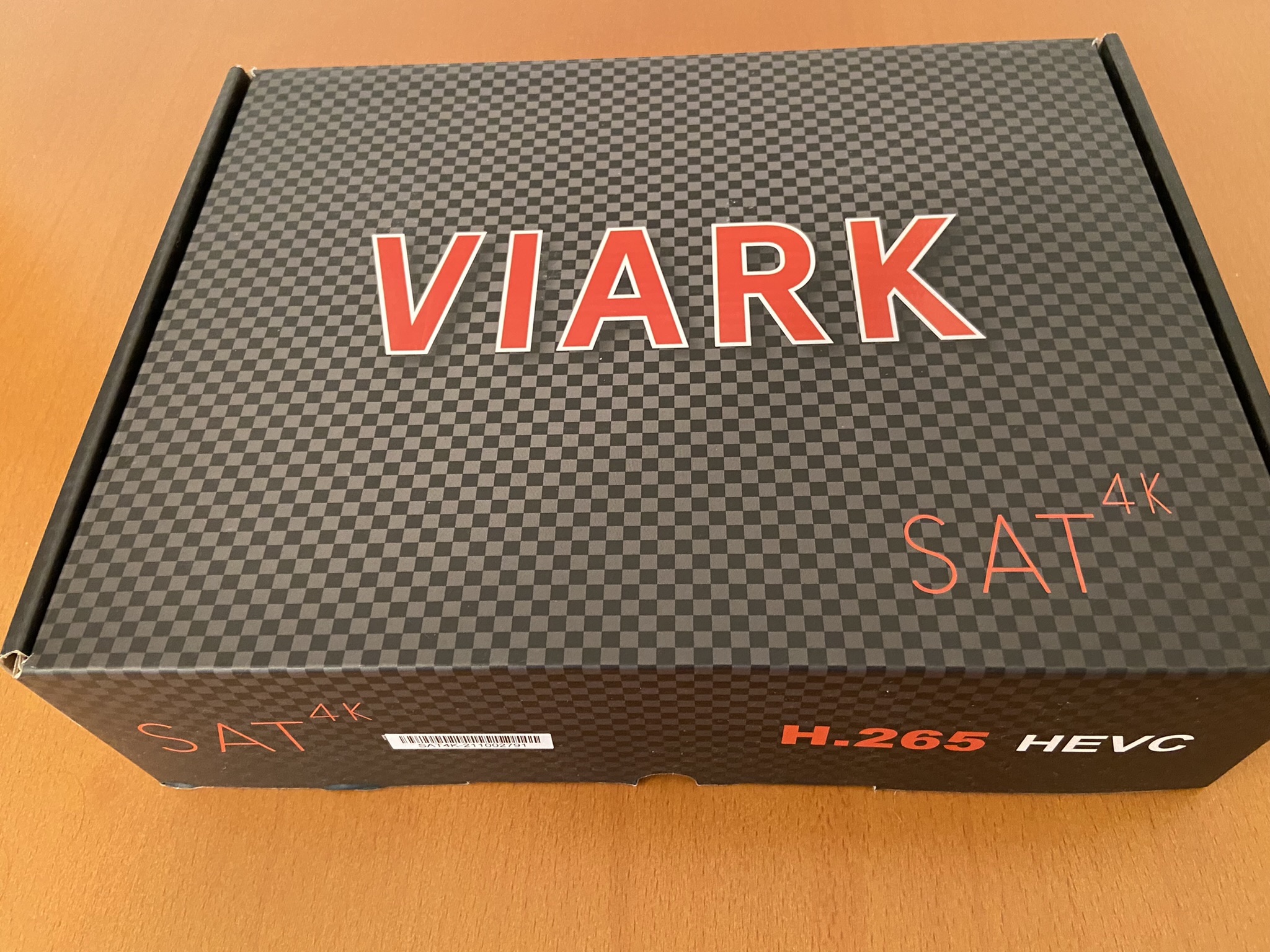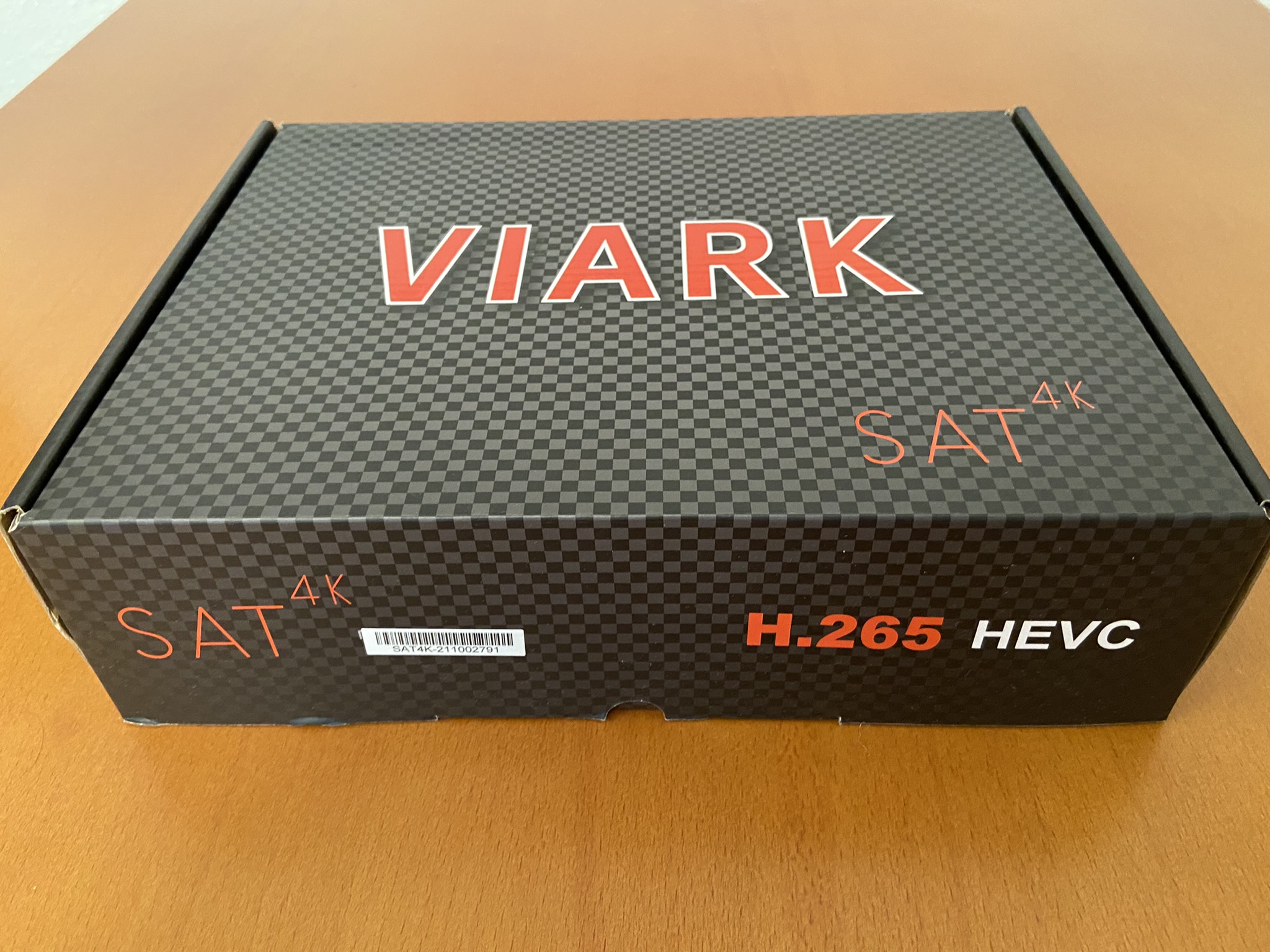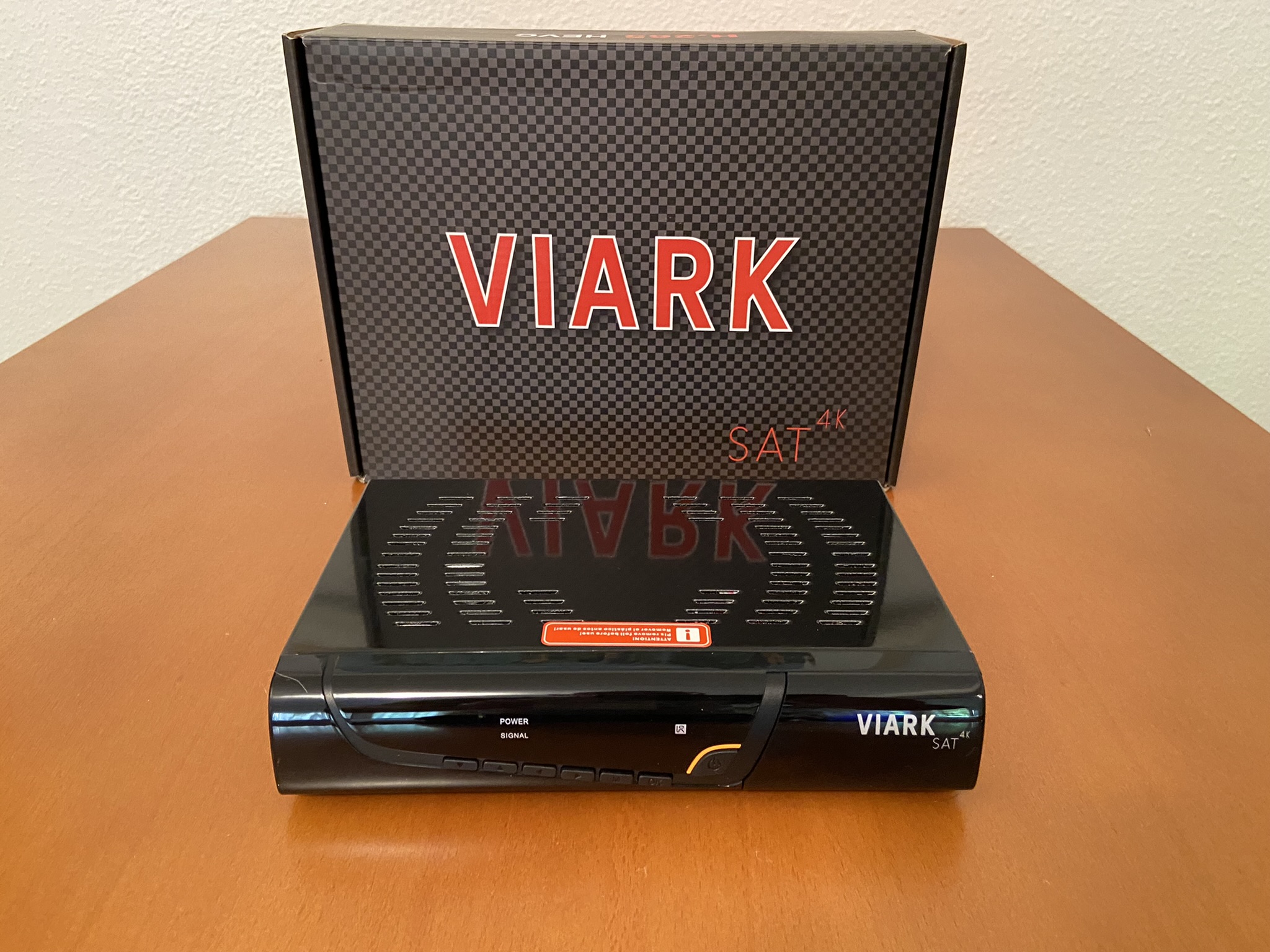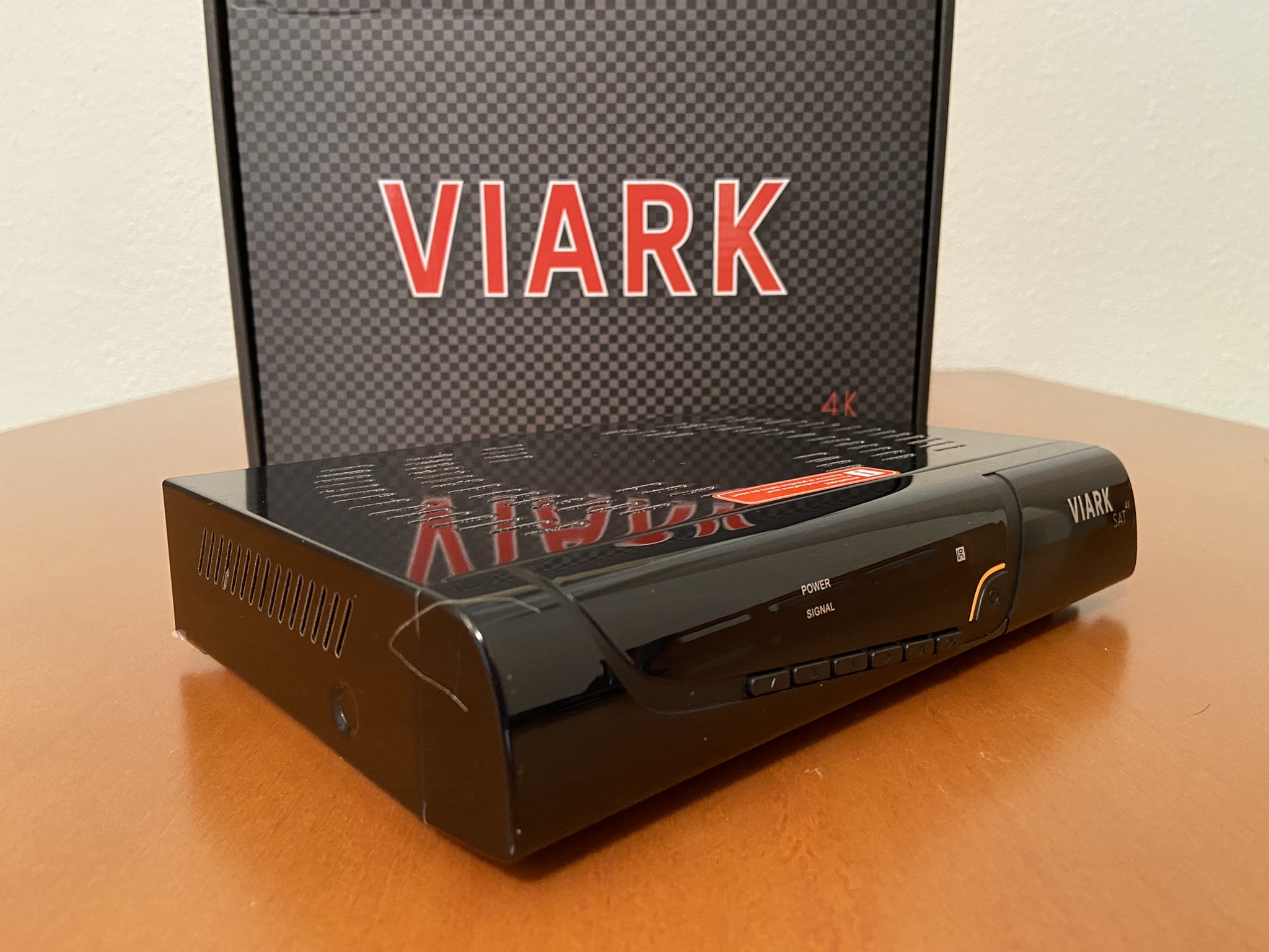 Viark Sat 4K tiene un diseño tipico cuadriculado con bordes redondeadas, en color negro serigrafiado en su parte frontal el modelo de la marca.