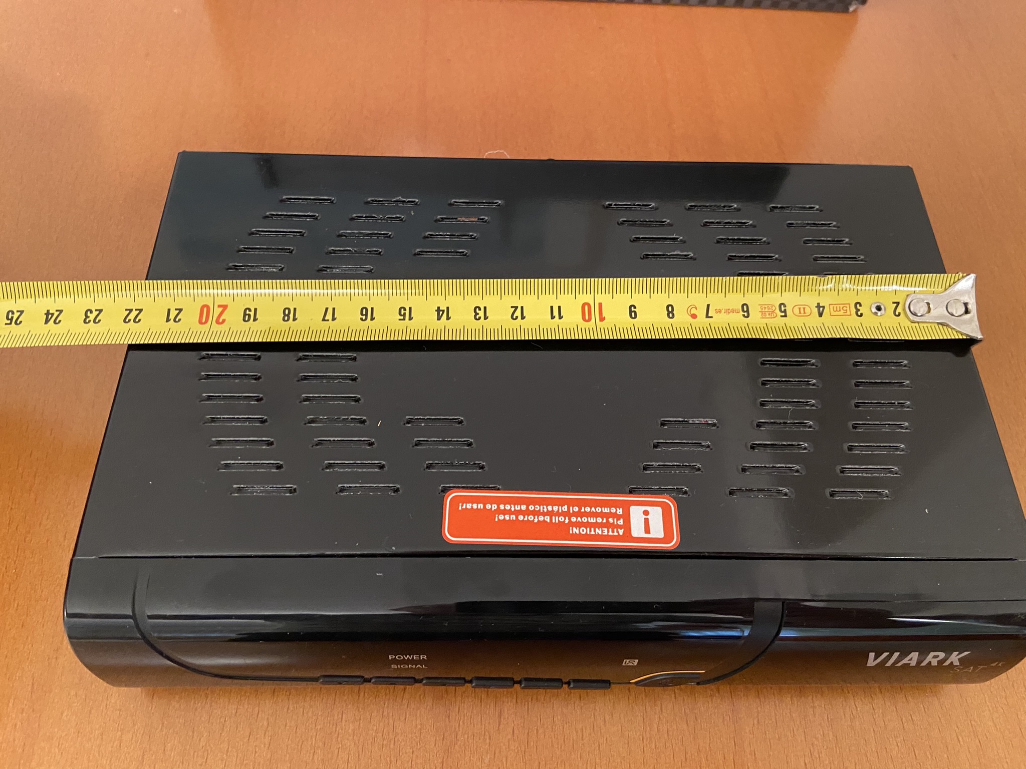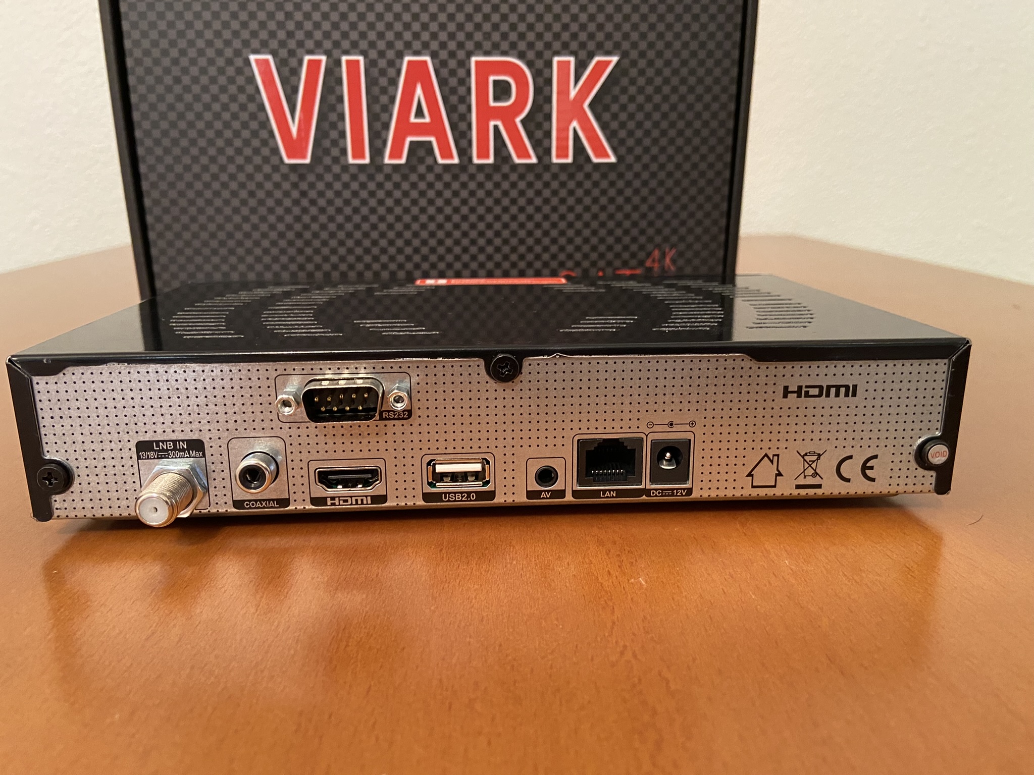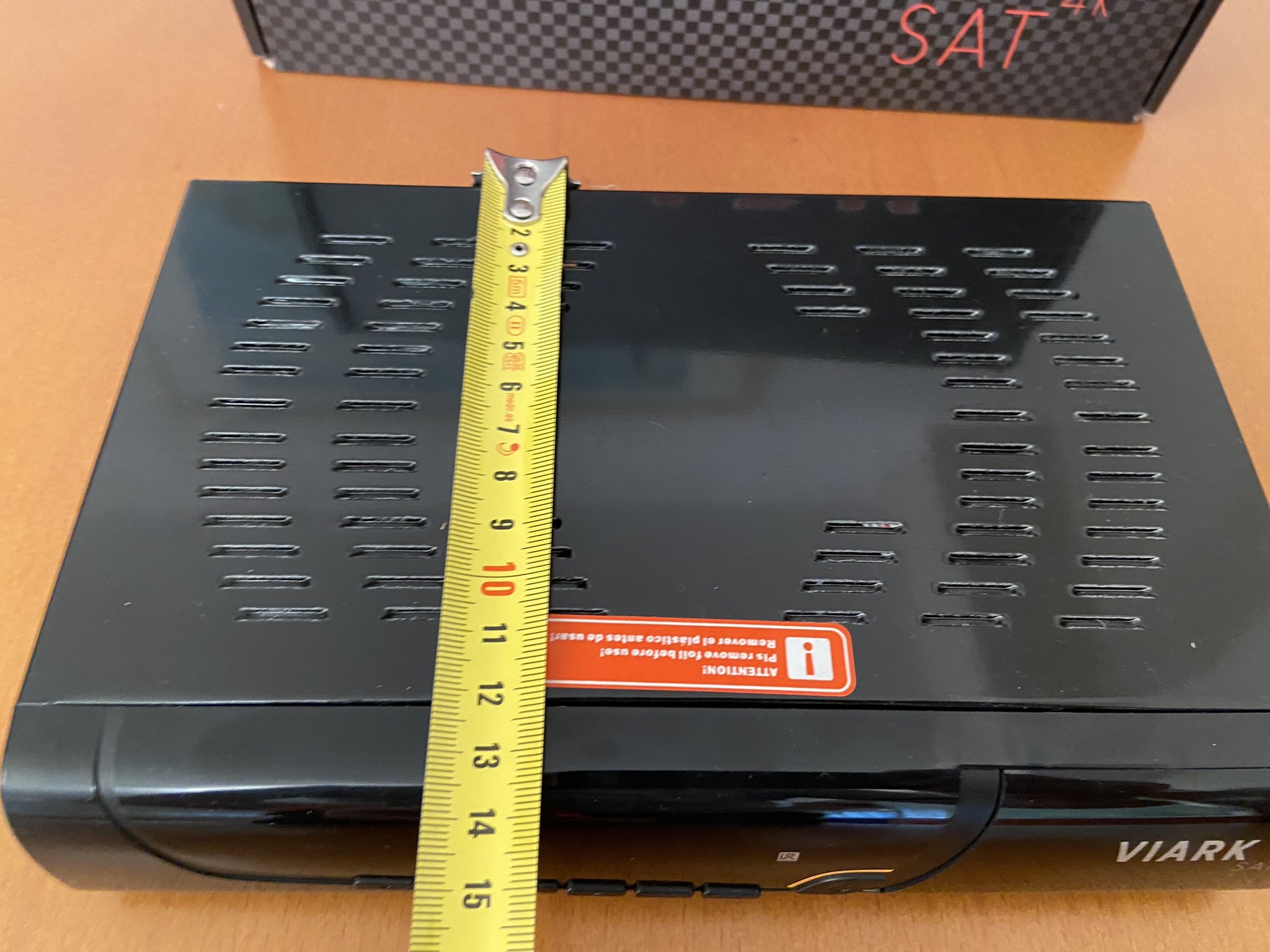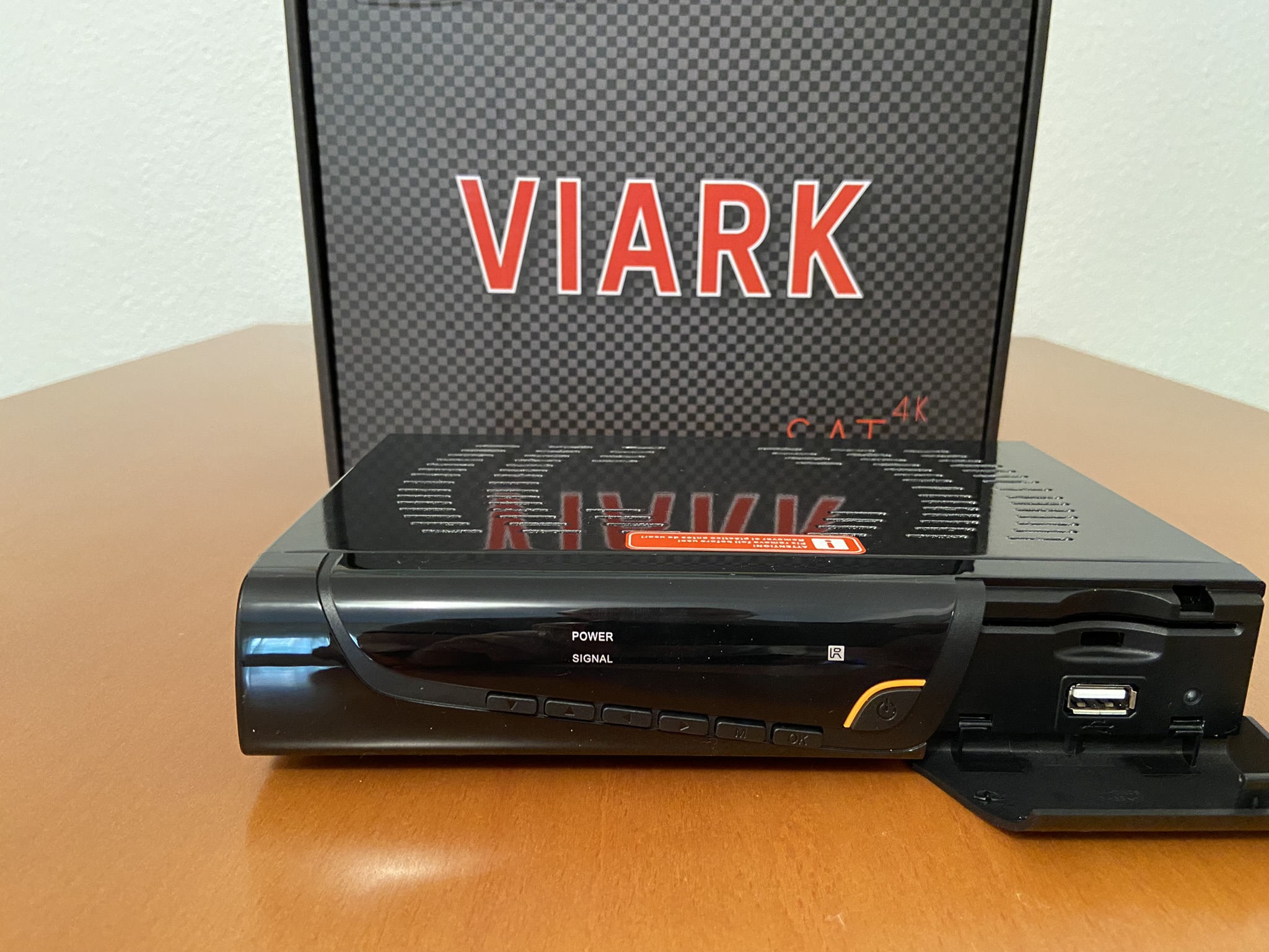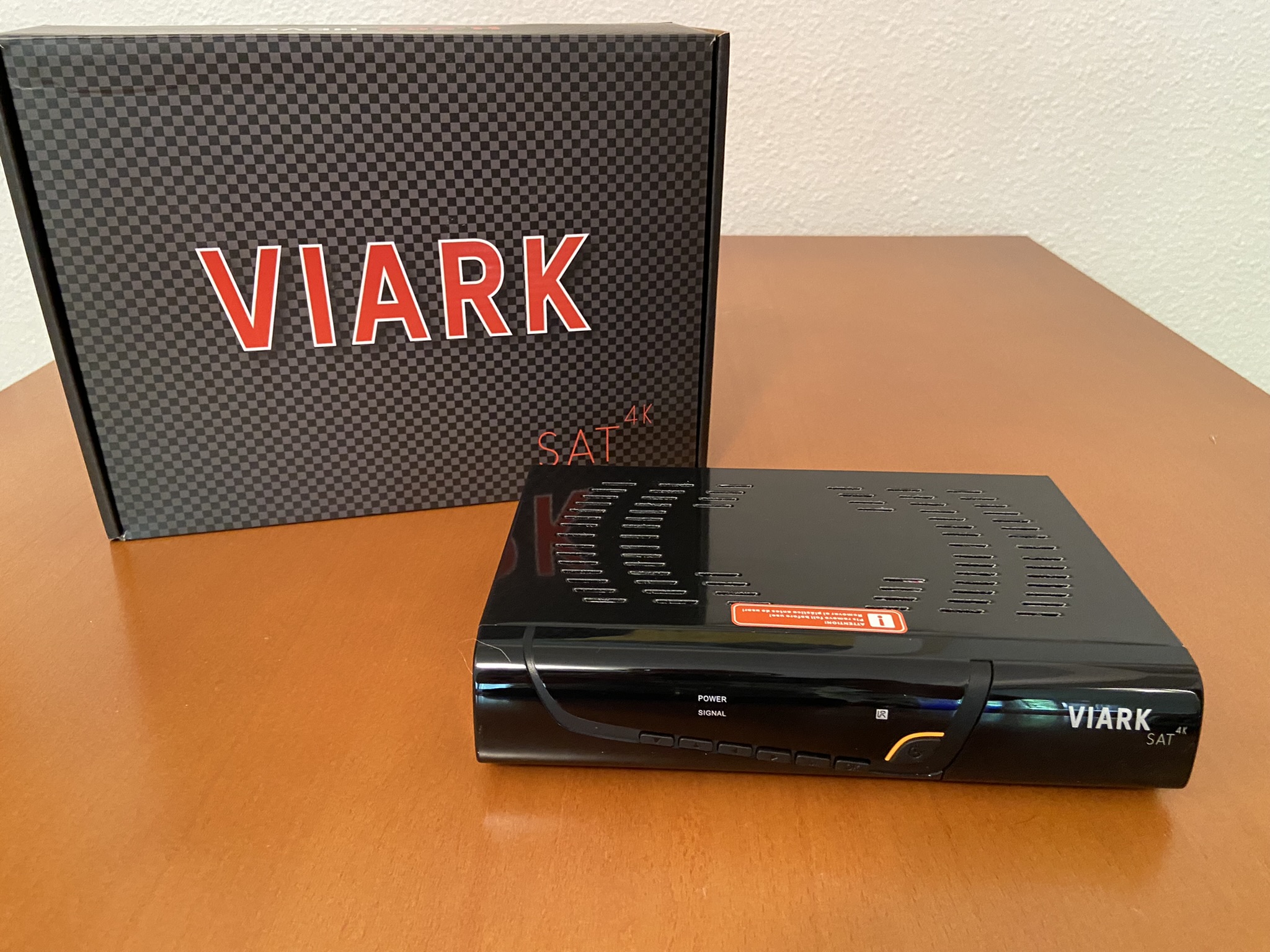 Viark Sat 4K tiene un diseño tipico cuadriculado con bordes redondeadas, en color negro serigrafiado en su parte frontal el modelo de la marca.