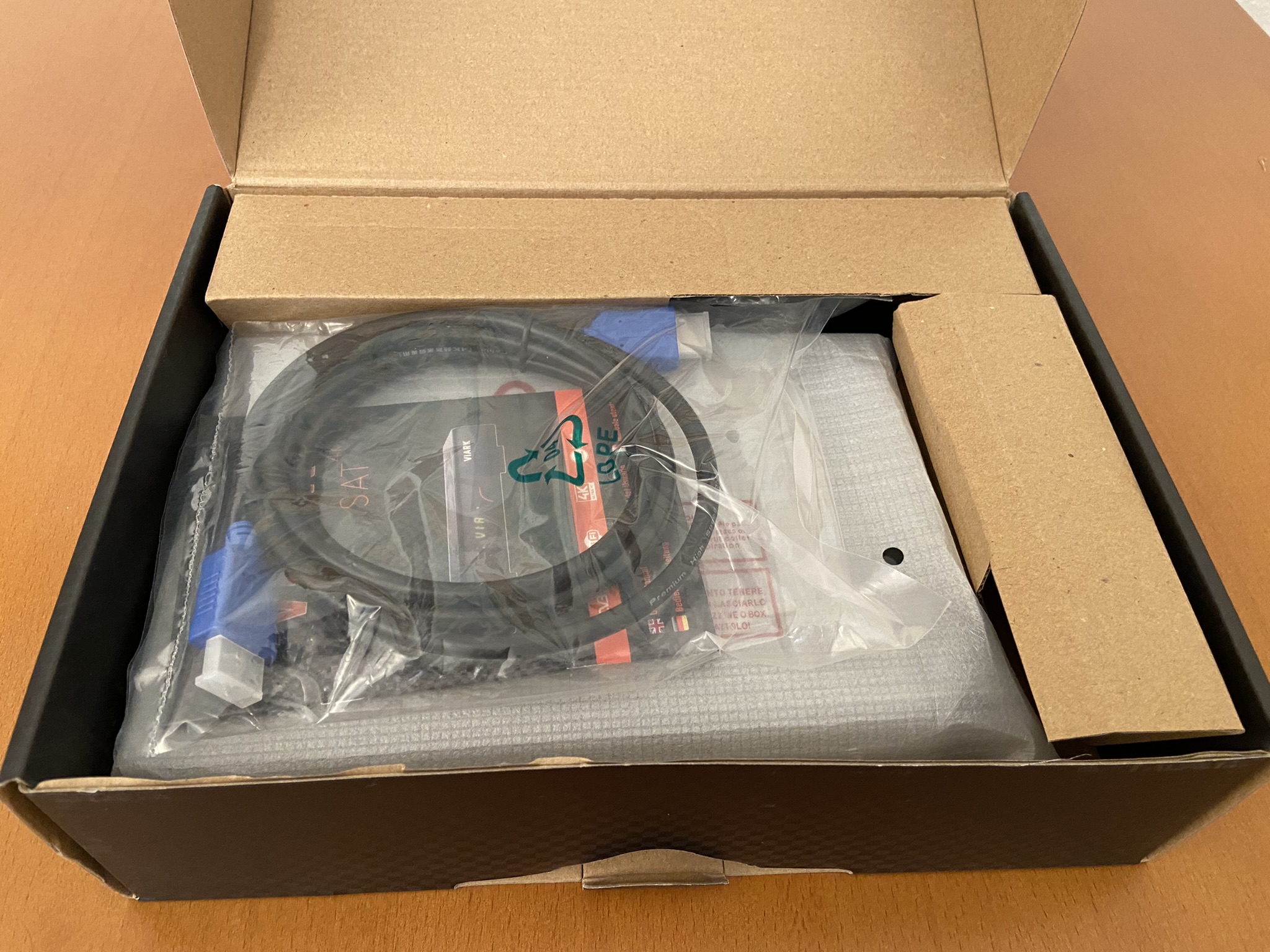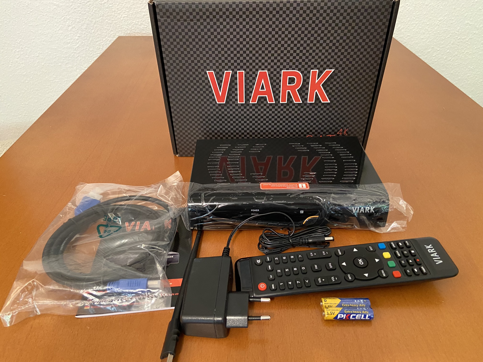 Viark Sat 4K se presenta en una caja de carton con colorido en tonos oscuros, donde se serigrafian las caracteristicas del receptor, en el interior nos encontramos: