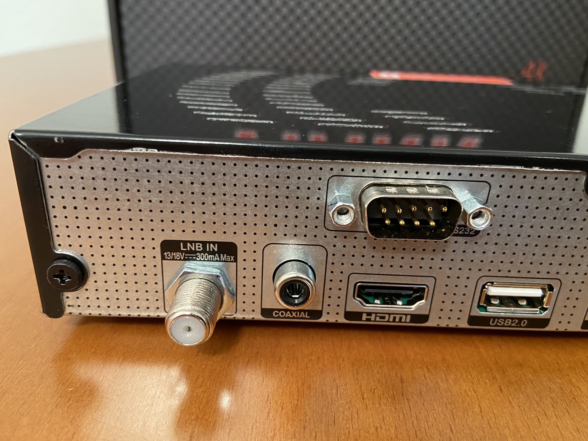 En la parte Posterior nos encontramos con el grueso de las conexiones conector Ethernet 10/100, , jack AV, HDMI 2.1 y conector de corriente, Tuner satelite y Usb 2.0, tuner satelite y conexion rs232.