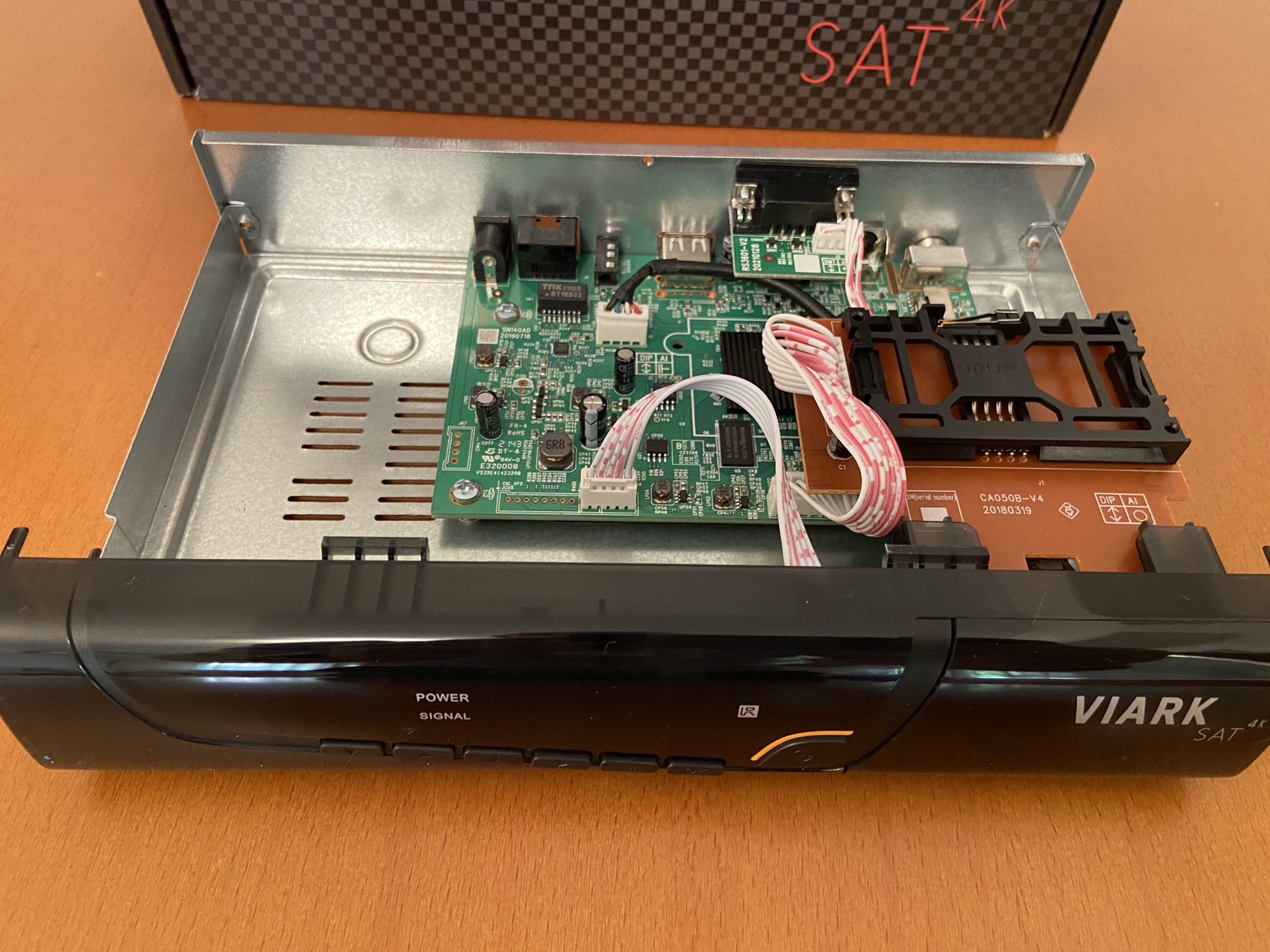 El Viark Sat 4K lleva integrado una memoria flash como almacenamiento interno de 16 megas, 512 megas de Ram, puertos usb 2.0 (2) .
