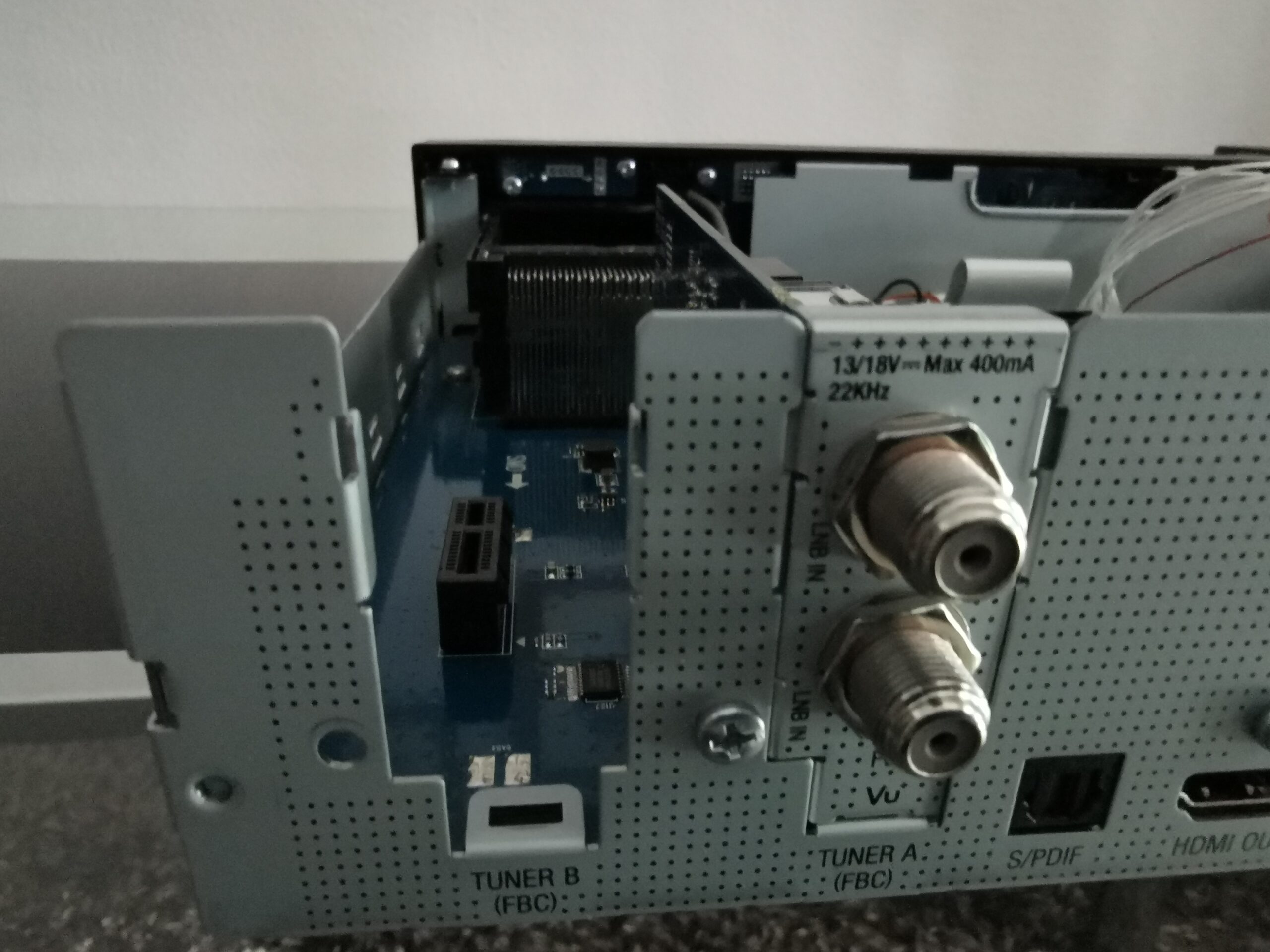 El receptor tiene dos ranuras tuner, una de las cuales vacía (opcional), para el caso de comprar otro tuner, en este caso dejamos captura de montaje de otro tuner dual FBC: