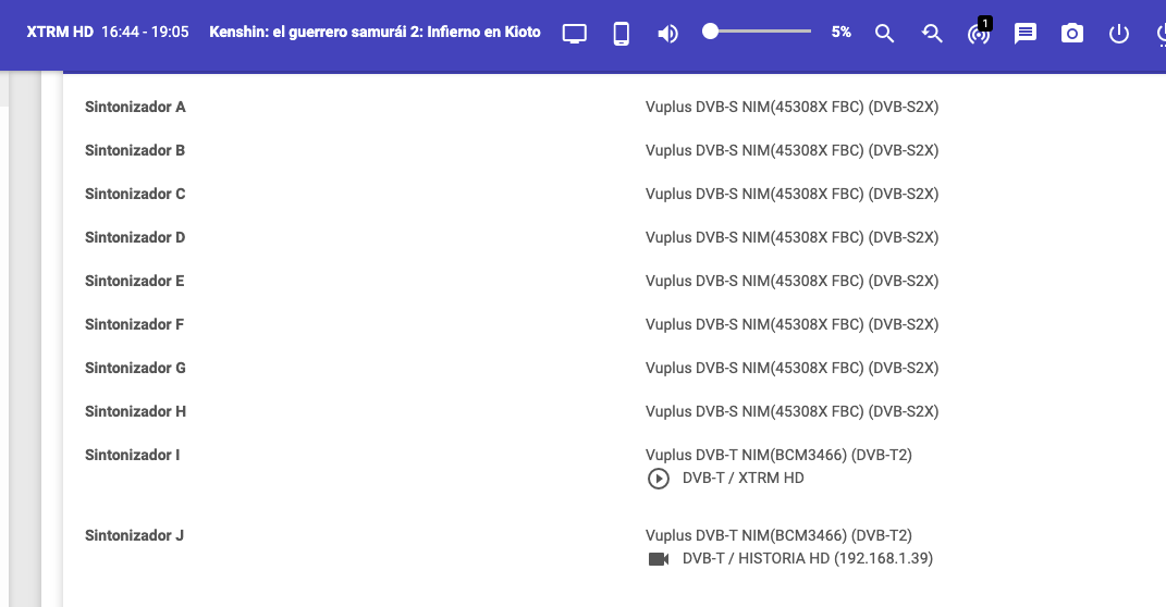 Ahora ponemos un canal TDT visionando en la tv y hacemos stream de otro canal de distinta frecuencia MUX, y nos aparecen en uso los dos sintonizadores: