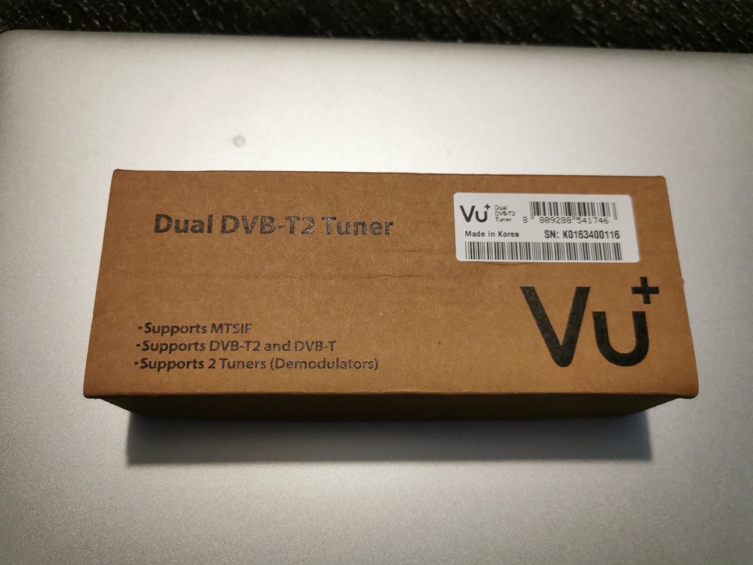 VU+ Tuner MTSIF Dual DVB-T2 viene en caja de carton tipica de vuplus en color marron, con las caracteristicas del tuner, unas fotos del tuner: