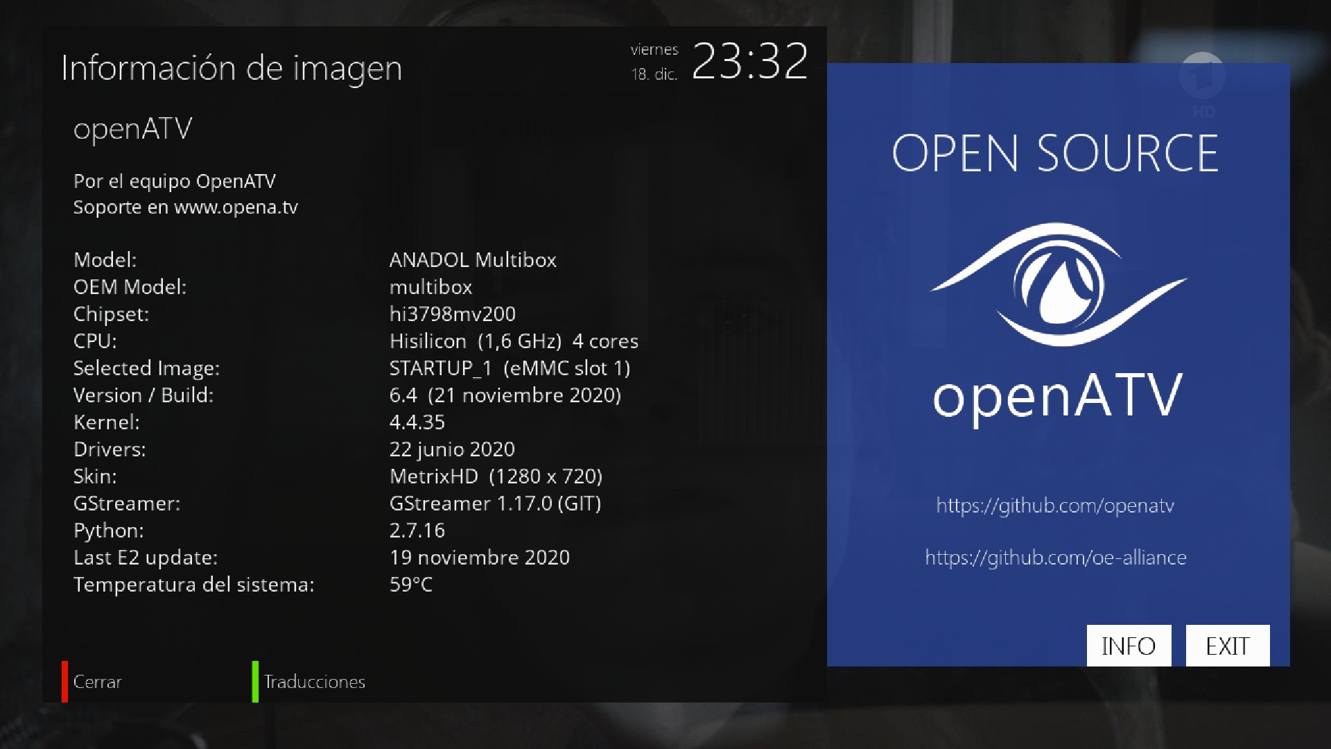 - Version del sistema de fabrica: openatv 6.4 fecha depende de la fabricacion asi como Android 7