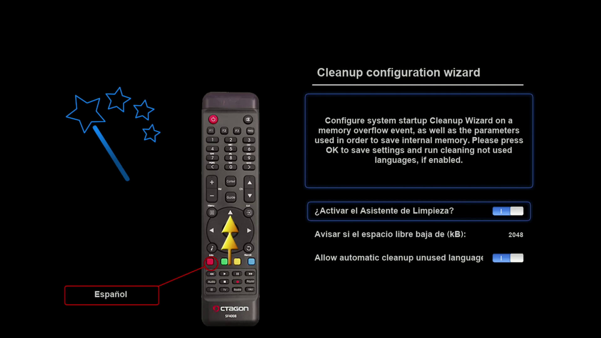 Una vez configurado el aspecto del menu osd, nos permite activar la opcion de limpiar automaticamente el cache de la memoria ram del receptor