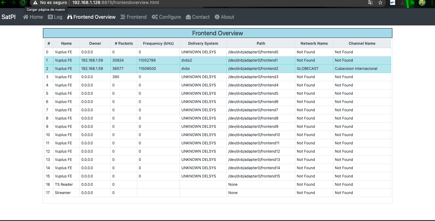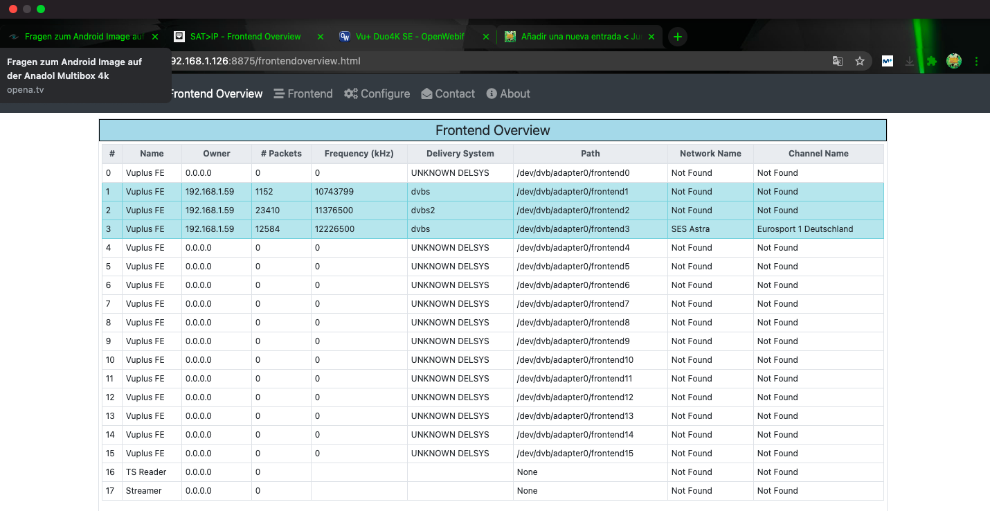 Pudiendo observar en la webiterface de satip servidor del deco la conexion con los tuner