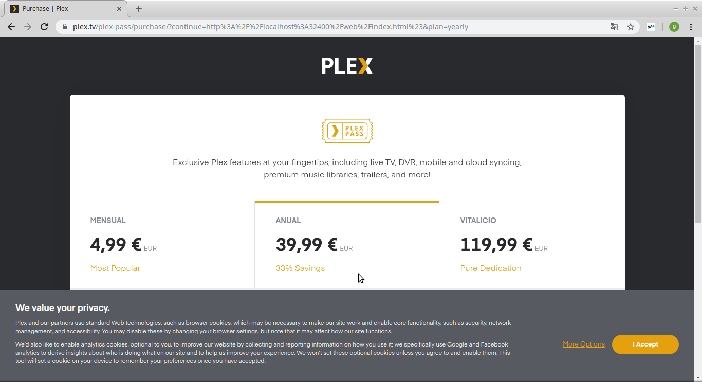 A continuacion nos solicitara subcripcion a plex pass que es obligatorio para poder usar live tv y dvr que es necesario, pues realizamos la subcriccion al plan que deseemos
