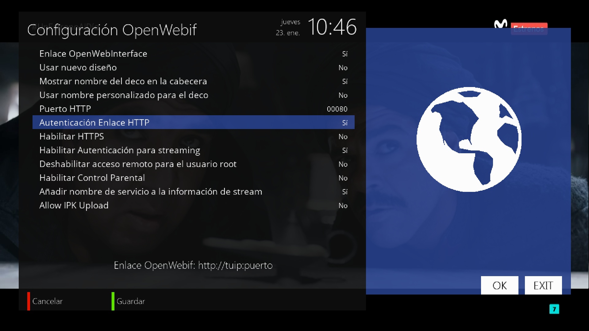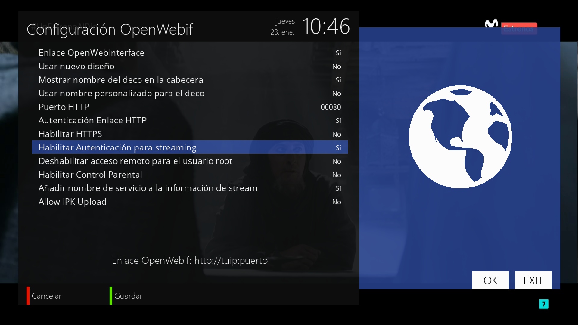 Una vez que nuestro receptor tiene password asignada es obligatorio para poder acceder al puerto 80 desde fuera de red tener habilitada la autentificacion en openwebif para ello accedemos a menu plugin + openwebif