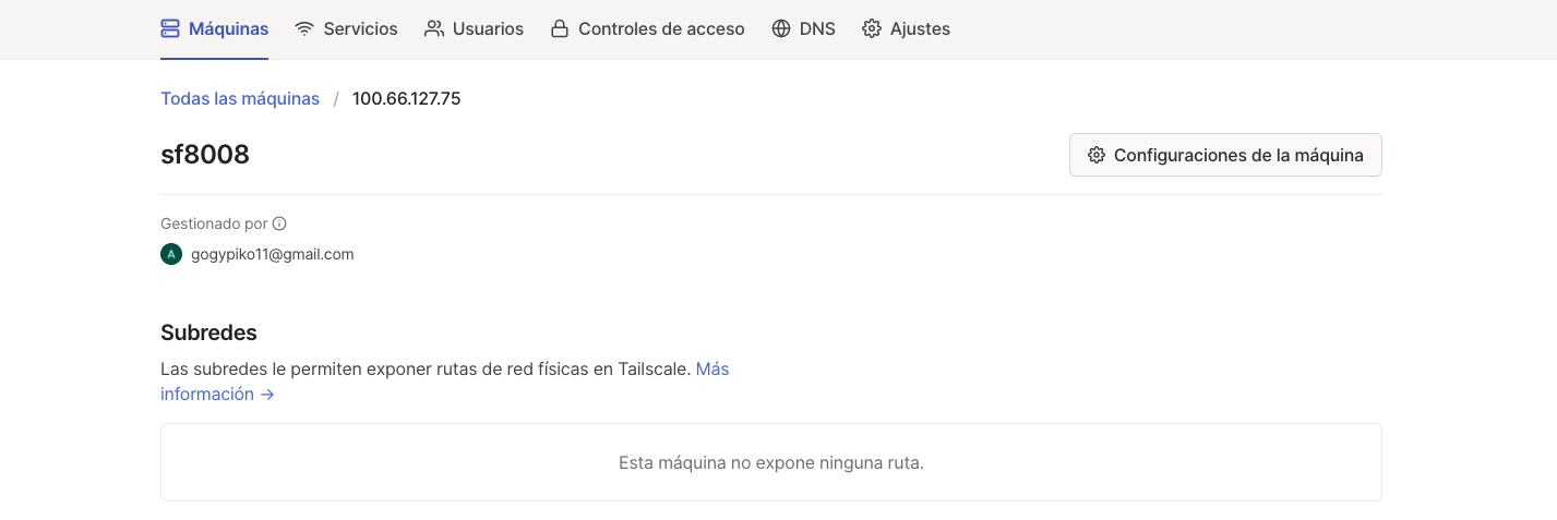 Tras este paso observaremos que en la web tailscale nos aparece nuestro receptor enigma2 en este caso un octagon sf8008, asi como la ip de conexion dentro de la red que en este ejemplo seria 100.66.127.75