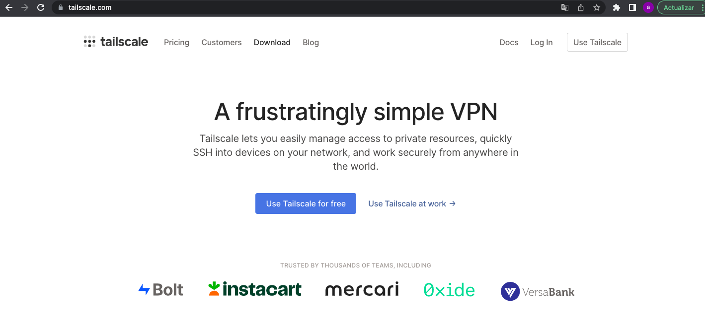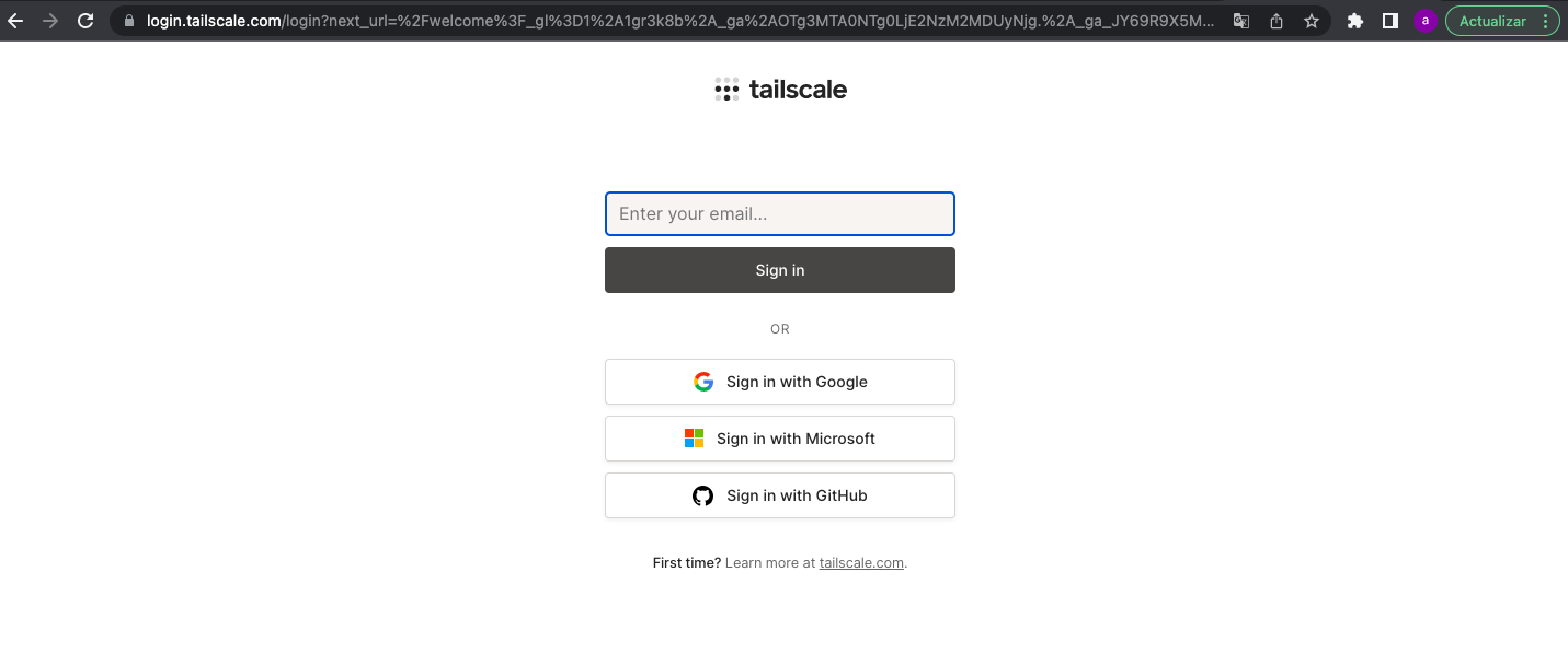1. En primer lugar debemos crear una cuenta en Tailscale, es gratuito a traves de su web: https://tailscale.com/