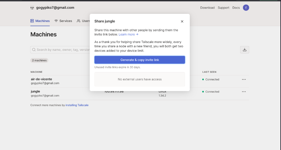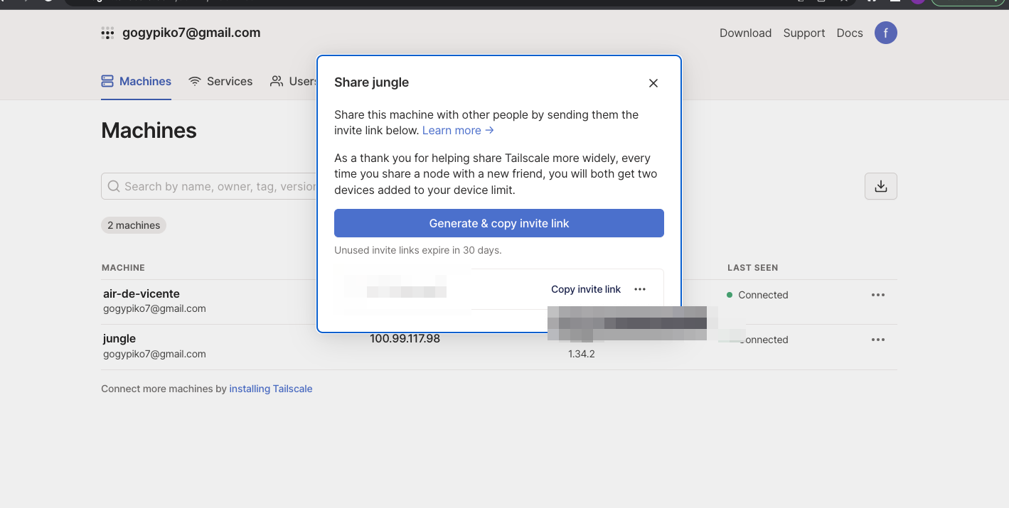 c) Copiamos el link de invitacion y se lo damos a la otra persona con cuenta tailscale diferente