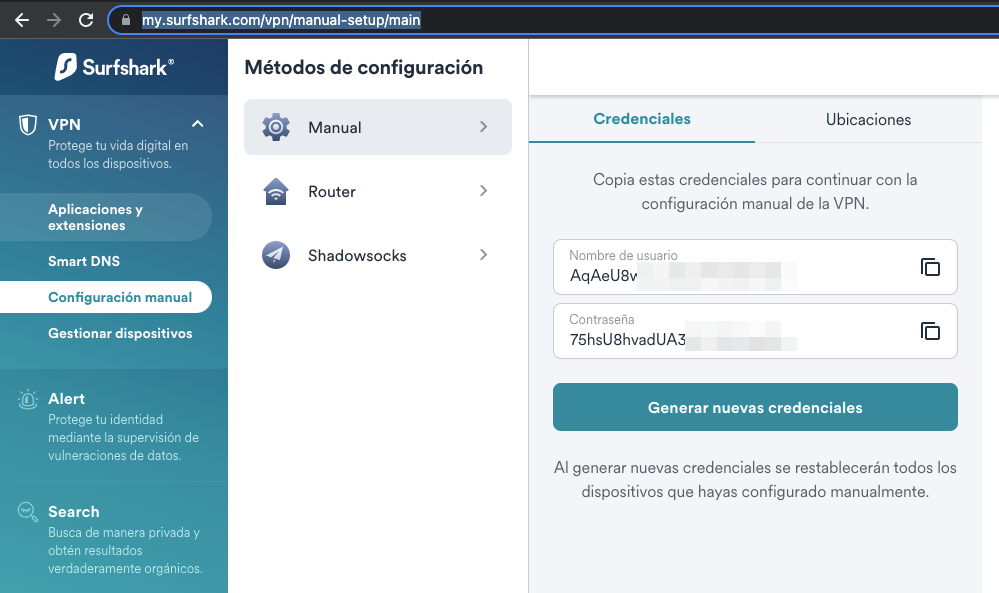 Tambien podeis pulsar directamente sobre este enlace https://my.surfshark.com/vpn/manual-setup/main y observaremos nuestras claves de usuario y contraseña o podemos generar unas nuevas si lo deseamos