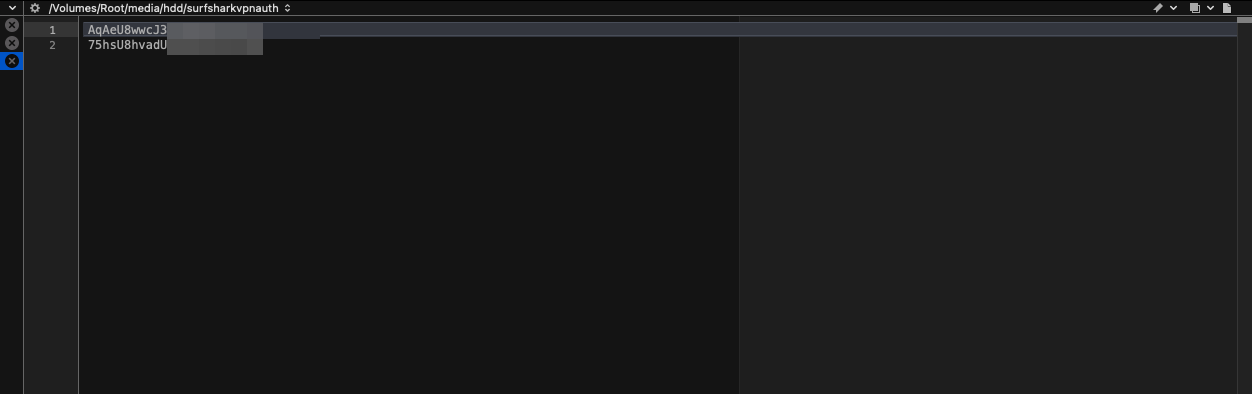 2. Descomprimimos el archivo y obtendremos un archivo llamado surfsharkvpnauth el cual lo abrimos con un editor de texto e introducimos nuestro nombre y usuario y contraseña en dos lineas