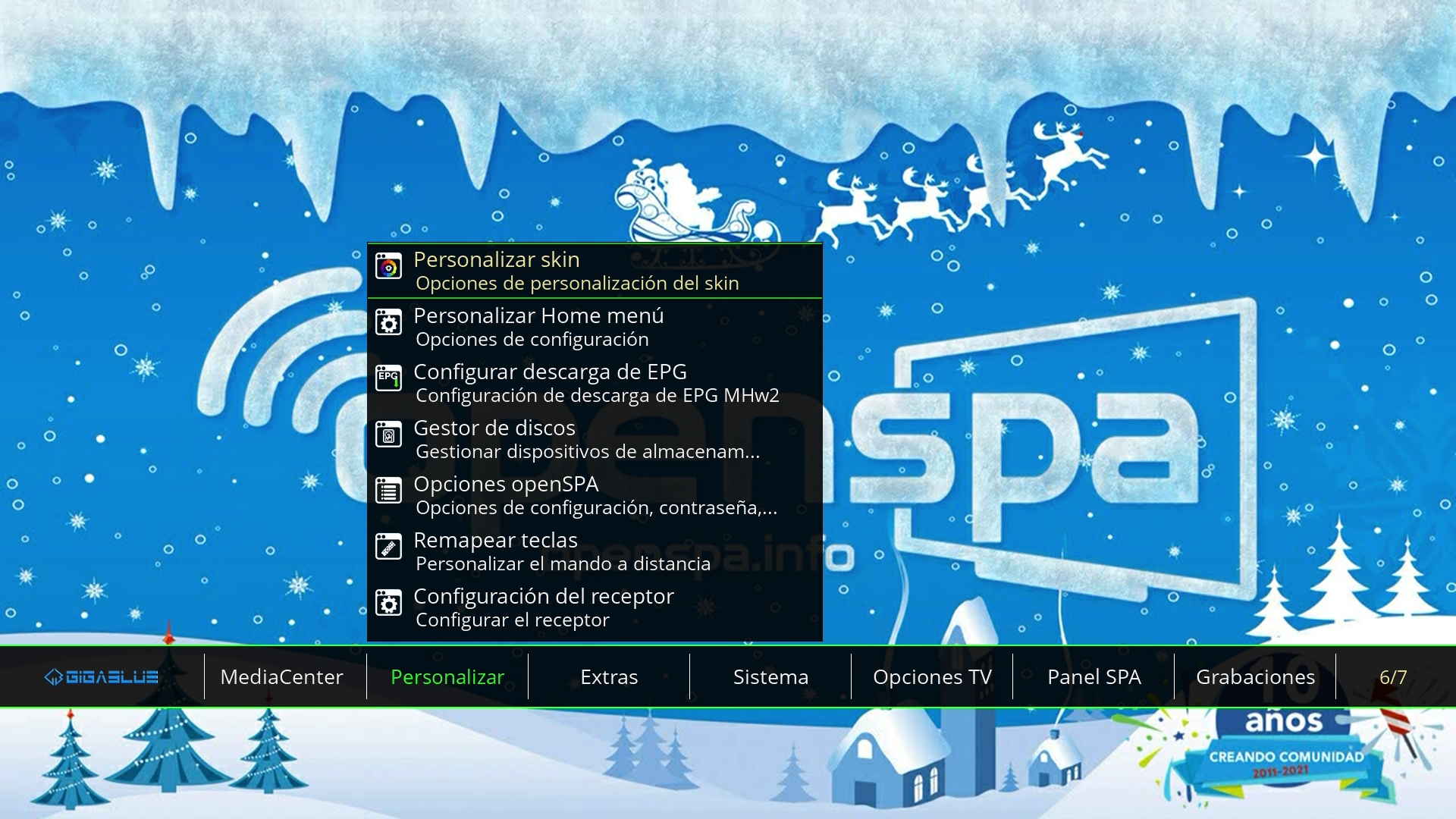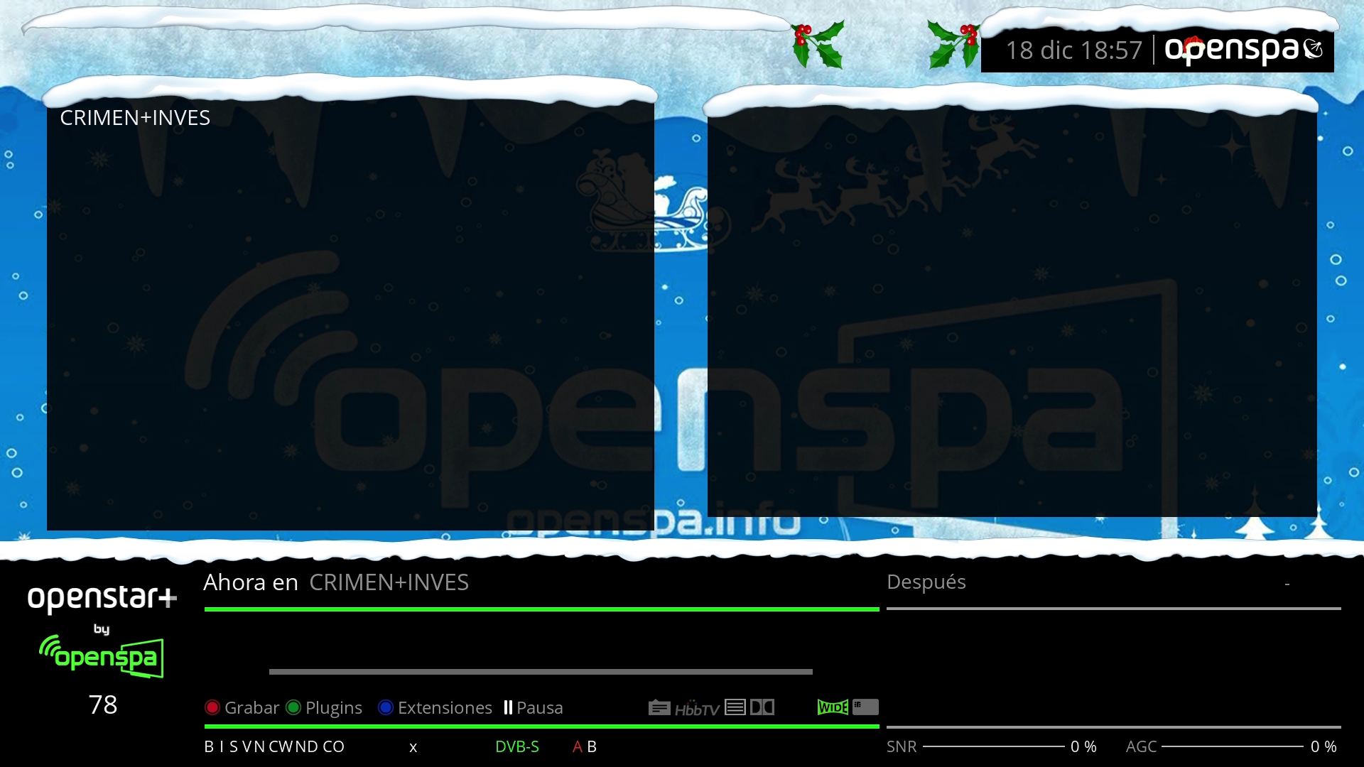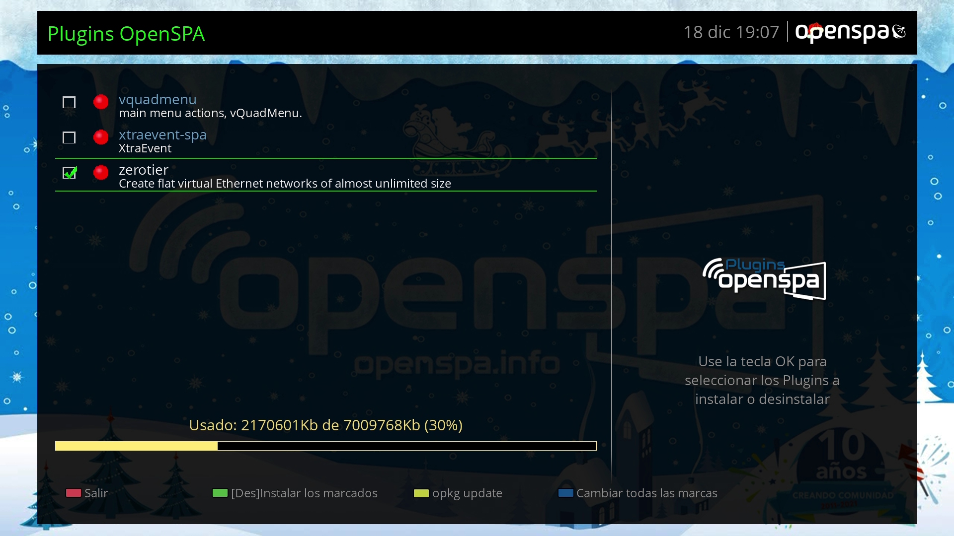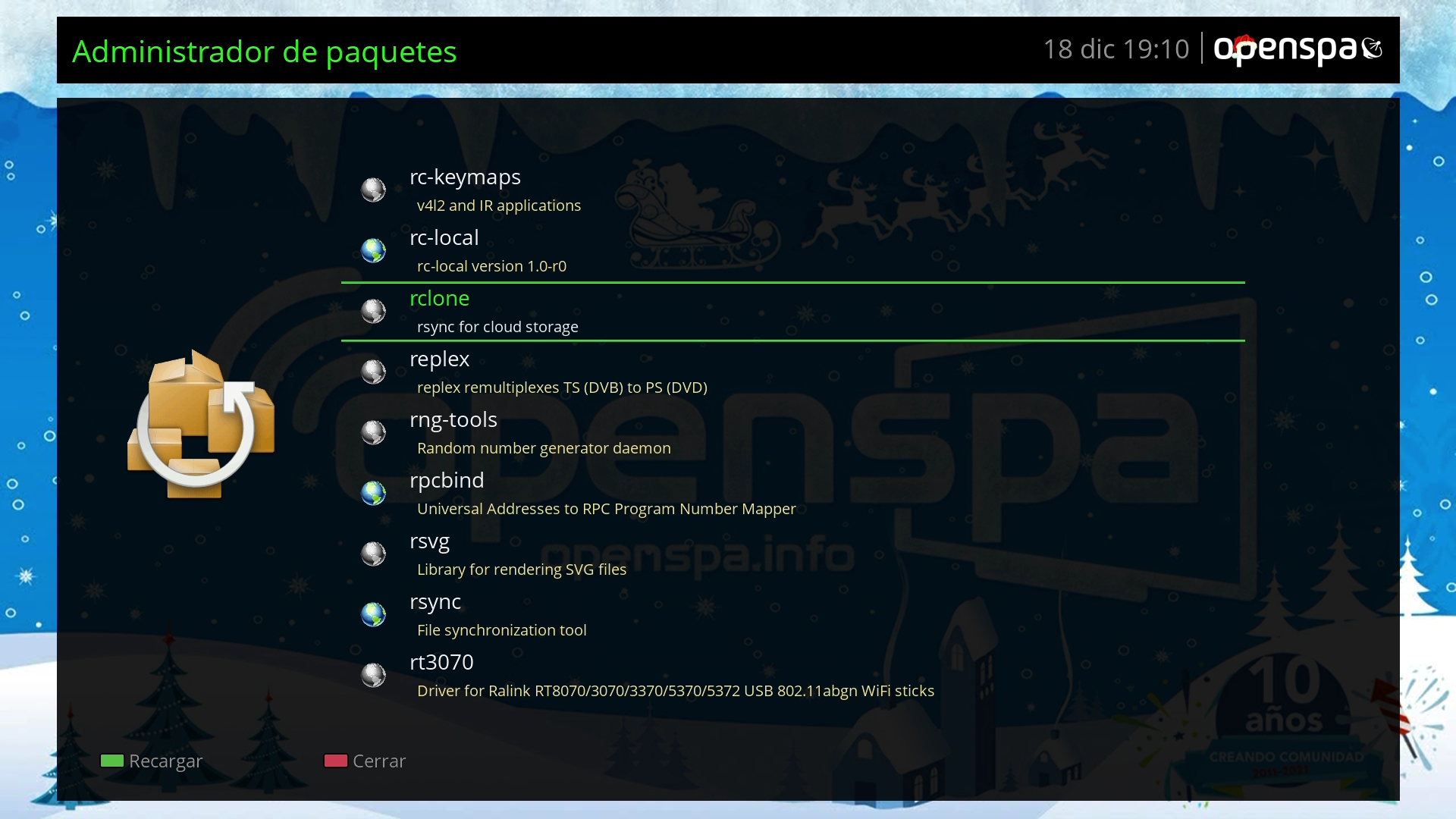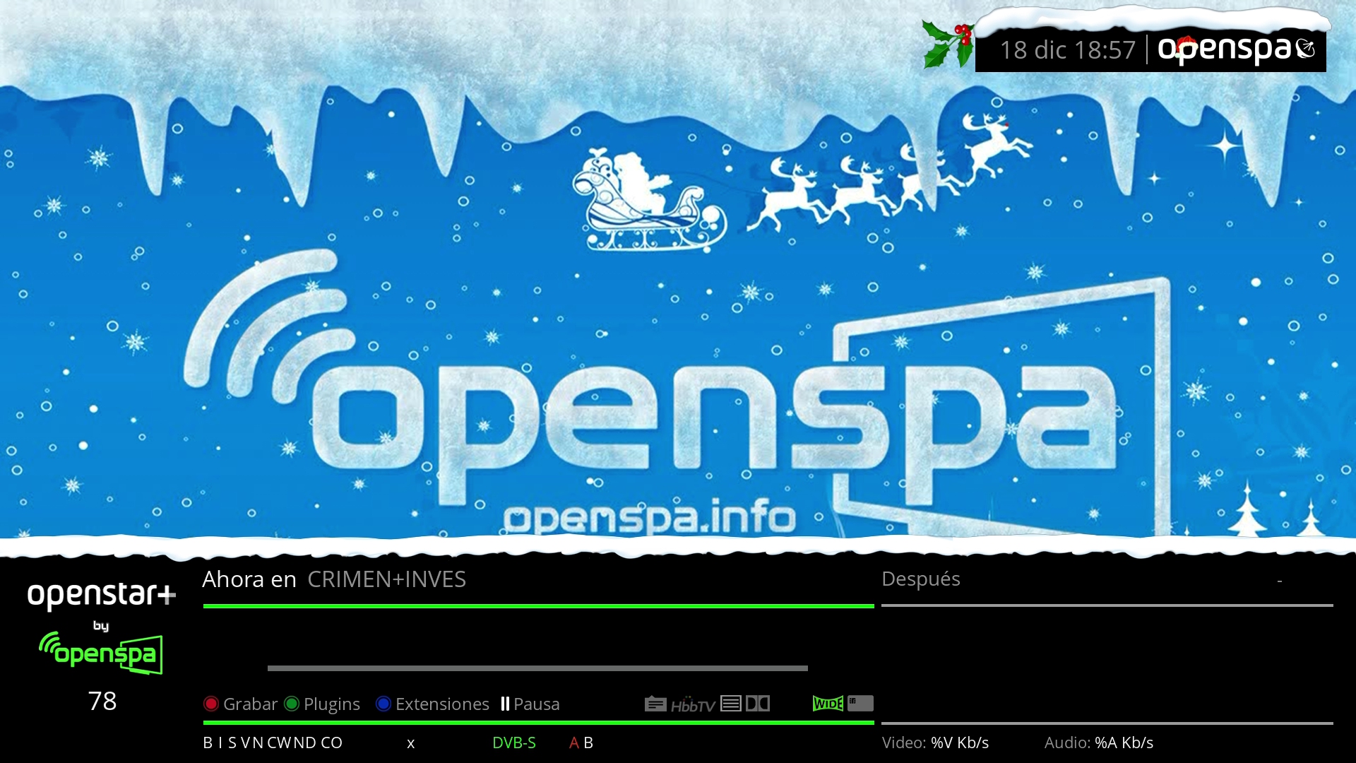 Ya esta disponible nueva version imagen enigma2 Openspa 7.5.004, en esta ocasion no trae grandes novedades, basicamente actualizacion de drivers de algunos modelos de receptores que desde hace unas semanas estan ya disponibles en oe-alliance, y en los que se refiere a la imagen openspa en si, basicamente actualizacion de los binarios de zerotier y rclone y añadido infobar estilo navideño.