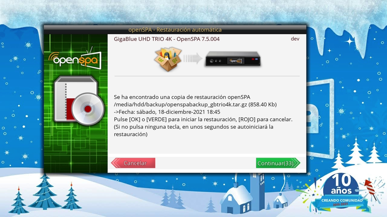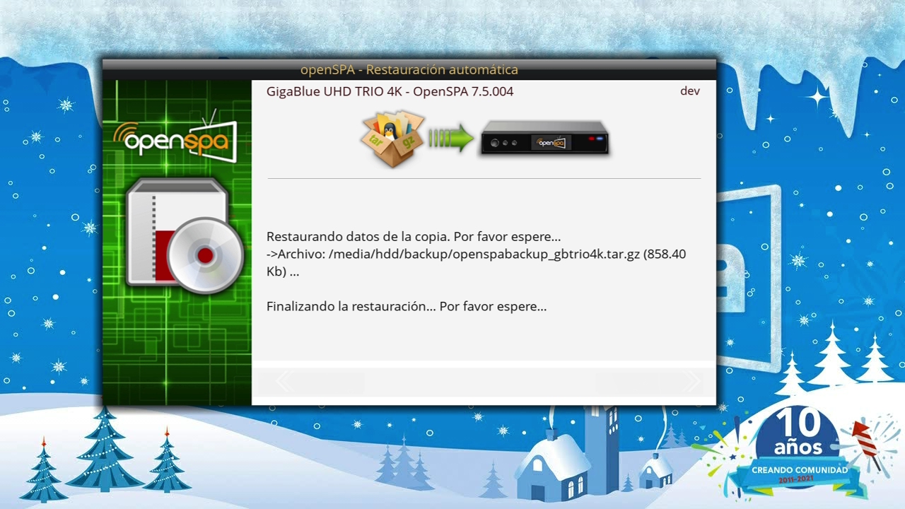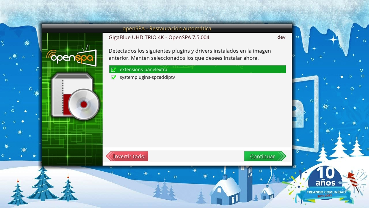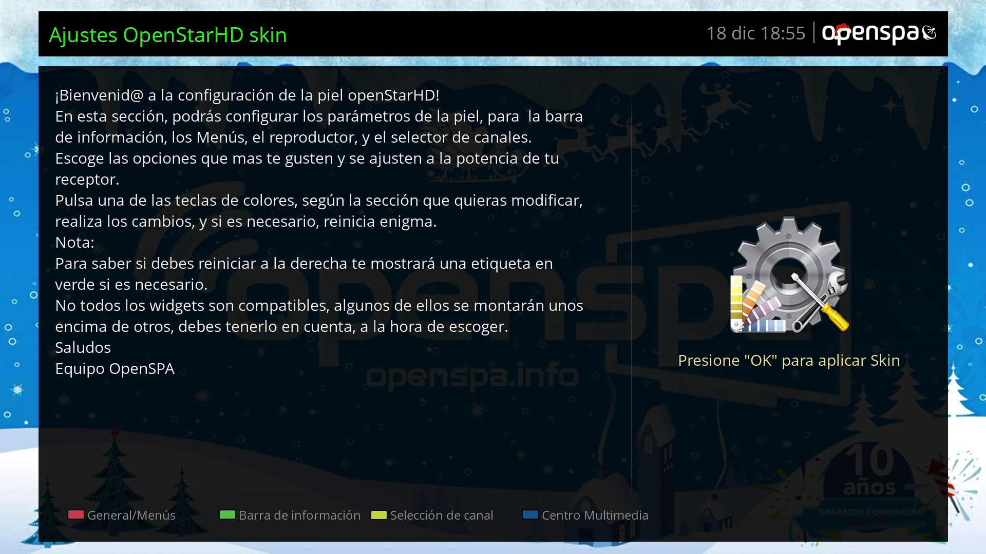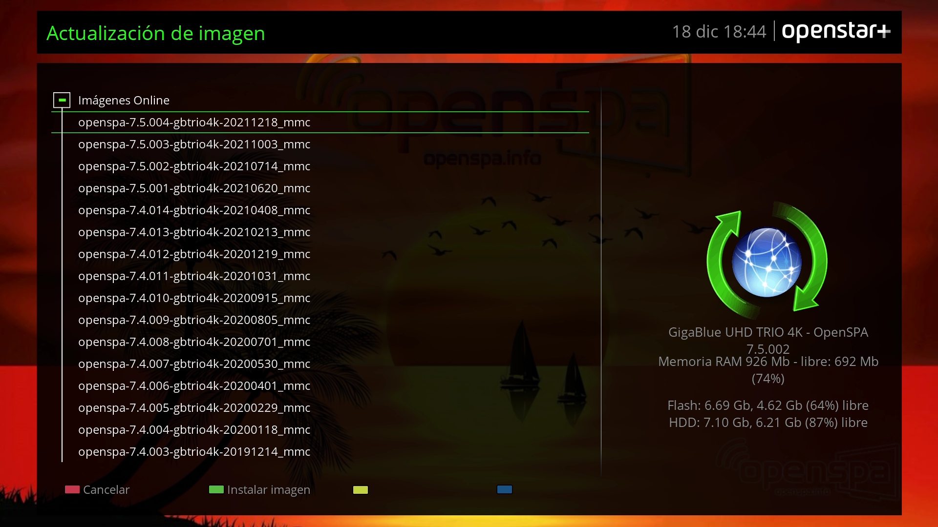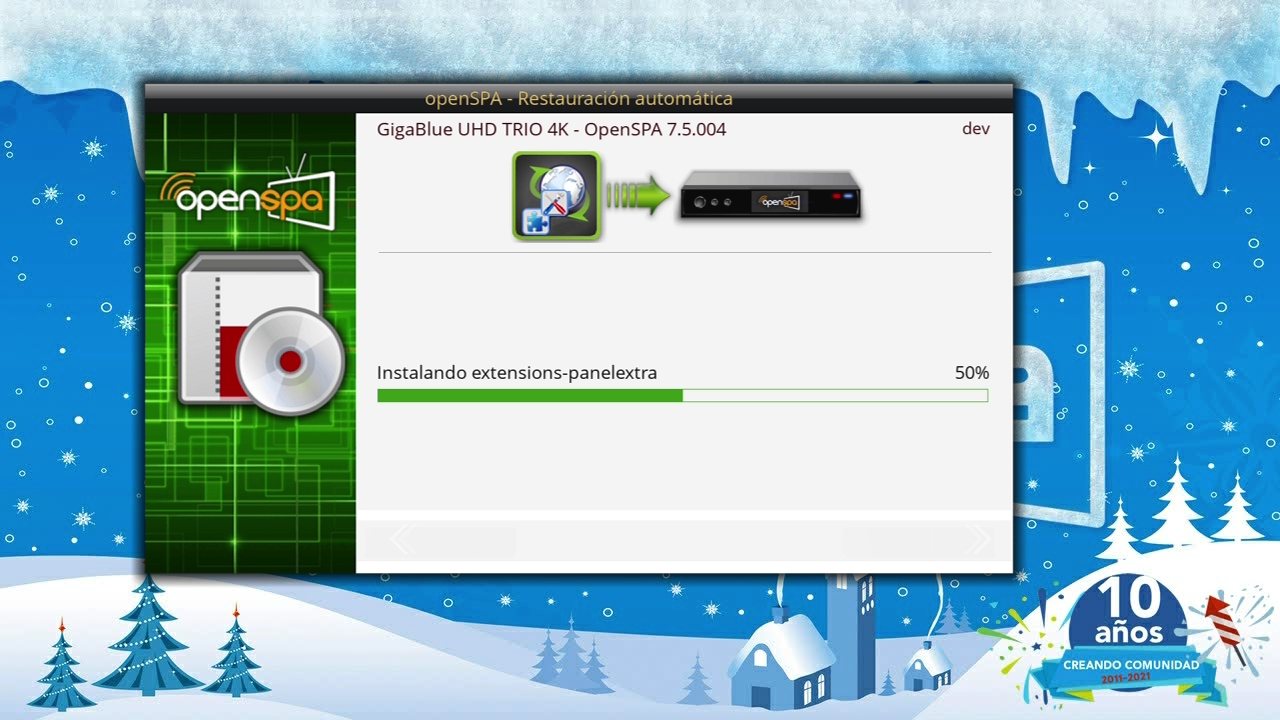 Ya esta disponible nueva version imagen enigma2 Openspa 7.5.004, en esta ocasion no trae grandes novedades, basicamente actualizacion de drivers de algunos modelos de receptores que desde hace unas semanas estan ya disponibles en oe-alliance, y en los que se refiere a la imagen openspa en si, basicamente actualizacion de los binarios de zerotier y rclone y añadido infobar estilo navideño.