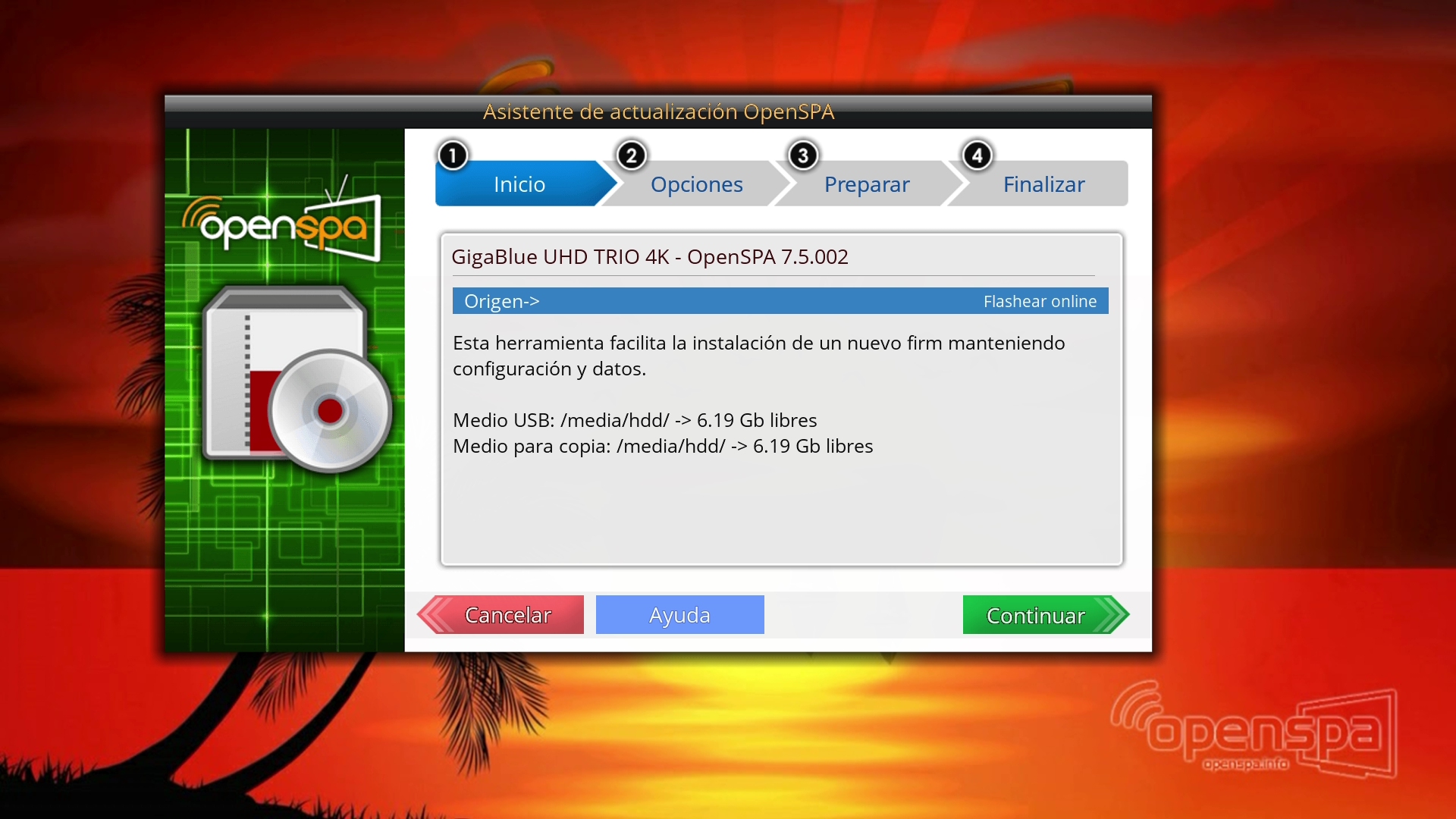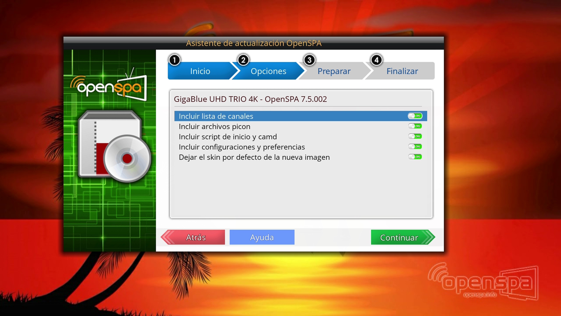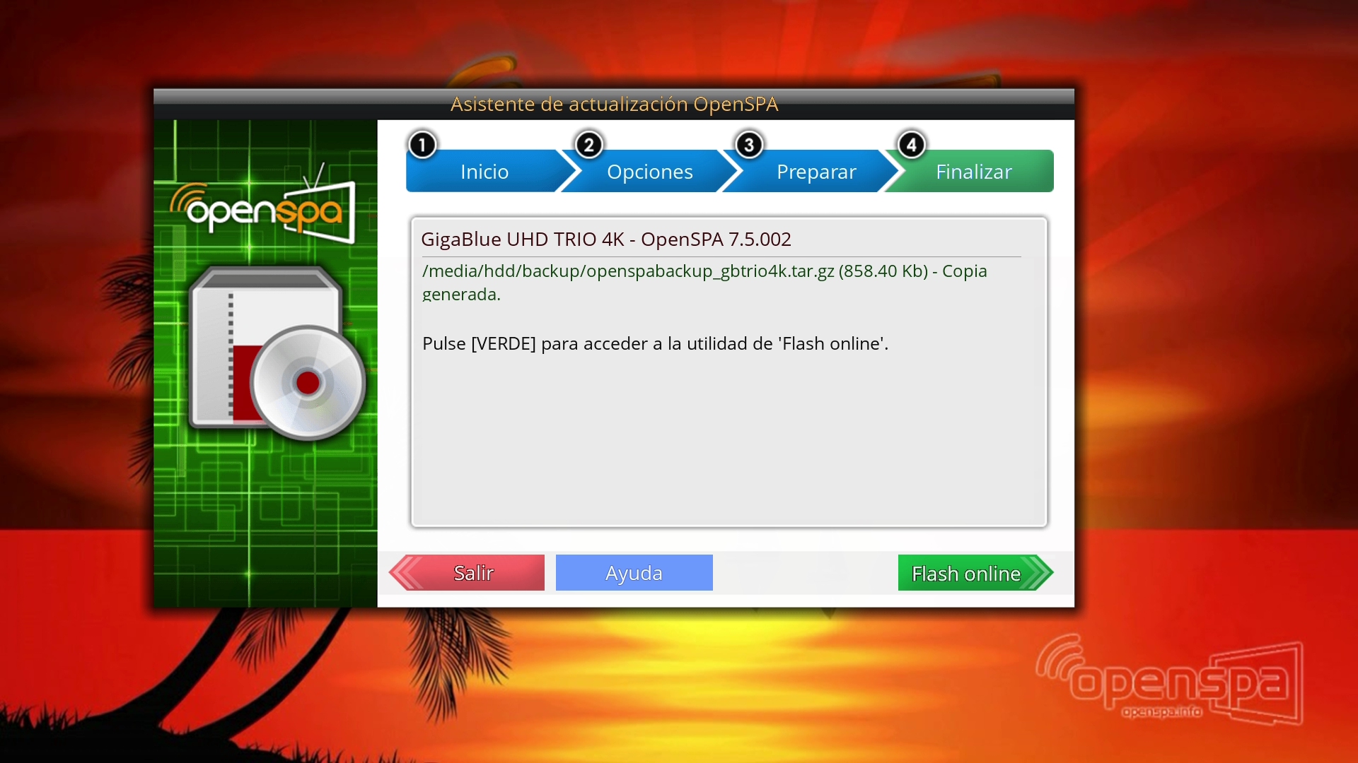 2. Otro metodo de instalacion es realizando backup previo, antes de acceder a flashonline, para ello accedemos a menu + sistema + plugins + asistente de actualizacion de openspa, en este caso, este backup creado solo llevaria utilidades openspa no algun archivo externo que veremos como poder realizarlo este backup con cosas externas mas adelante.